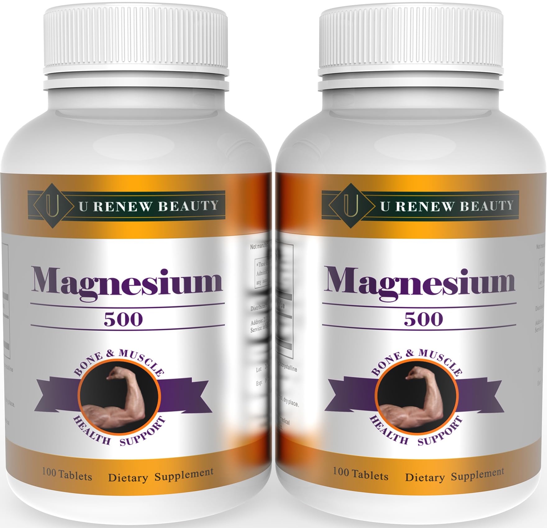 URENEWBEAUTY Magnesium Supplement 460mg per Tablet 2 Bottles (200 Tablets Total) USA Made Non-GMO Gluten-Free Supports Muscle Relaxation & Bone Health
