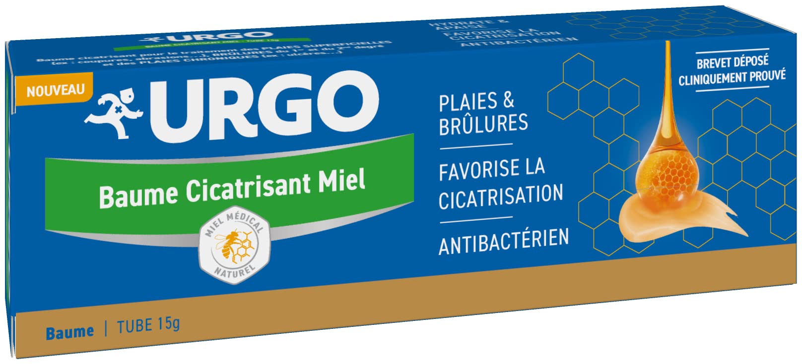 : ALL YOUR AILMENTS DESERVE URGO. Cuts, blisters, canker sores, back pain. Urgo offers effective and innovative solutions for all the ailments that disrupt your daily life. Five product lines are available: First Aid, Feet Hands, Face, Pain, and Nursing Care for wound management. Ingredients: 40 medical-grade honey, medical-grade hypoallergenic lanolin, propylene glycol, PEG 4000, and vitamins C and E. Due to its natural ingredients, each batch may vary in color (yellow to brown), viscosity, and may contain visible sugar crystals. These variations do not affect the product's effectiveness or use. P.when('A').execute(function(A) { A.on('a:expander:toggle_description:toggle:collapse', function(data) { window.scroll(0, data.expander. expander[0].offsetTop-100) }) }) Instructions: Apply a thin layer of the ointment directly to the wound, covering it completely. Repeat application as needed, following the frequency recommended for your specific wound type and condition. See moreIf you have any questions about this product or experience any adverse effects, please contact serviceconso fr.urgo.com. FOR THE WHOLE FAMILY. 15ml size. HYDRATES and SOOTHES. MEDICAL GRADE HONEY: possesses antibacterial properties. PROMOTES HEALING: creates conditions favorable to healing upon contact with the wound. HEALING BALM: for the treatment of superficial wounds and first- and second-degree burns.Description du produit TOUS VOS MAUX MERITENT URGO, Coupure, ampoule, aphte, mal de dos. Urgo, ce sont des solutions efficaces et innovantes pour tous les maux qui vous gâchent la vie au quotidien. Cinq gammes de produits sont disponibles : Premier Soin, Pieds Mains, Visage, Douleur et Soins infirmiers pour la prise en charge des plaies. Ingrédients 40 de miel de qualité médicale, lanoline hypoallergénique de qualité médicale, propylène glycol, PEG 4000 et vitamine C et E.De par ses ingrédients naturels, chaque lot peut varier en couleur (jaune à marron), viscosité et peut contenir des cristaux de sucre visibles. Ces variations n'affectent pas l'efficacité ni l'usage du produit. P.when('A').execute(function(A) { A.on('a:expander:toggle_description:toggle:collapse', function(data) { window.scroll(0, data.expander. expander[0].offsetTop-100) }) }) Mode d'emploi Appliquer une fine couche de l'onguent directement sur la plaie, en la recouvrant complètement. Répéter l'application selon les besoins, en suivant la fréquence recommandée pour votre type de plaie et votre condition spécifiques. Voir plusSi vous avez des questions concernant ce produit ou en cas de survenue d'un effet indésirable, veuillez contacter serviceconso fr.urgo.com. POUR TOUTE LA FAMILLE. Format 15ml. HYDRATE et APAISE. MIEL DE QUALITÉ MÉDICALE : possède des propriétés antibactériennes. FAVORISE LA CICATRISATION : créer au contact de la plaie les conditions favorables à la cicatrisation. BAUME CICATRISANT : pour le traitement des plaies superficielles et brulûres du 1er et 2nd degré.Urgo - Baume Cicatrisant au Miel de qualité médical - 15g
