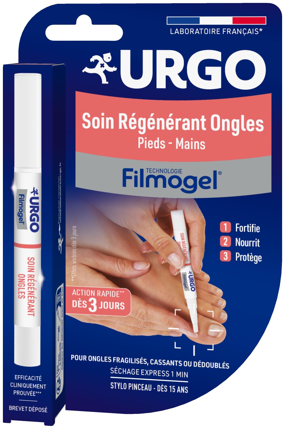 URGO Filmogel REGENERATING NAIL TREATMENT is a cosmetic. Forms a protective film on the surface of the nail while allowing the diffusion of ingredients to regenerate and strengthen the nail. Thanks to its speed of action, its effects can be noticeable after three days of use. 1. When using for the first time, turn the rotating tip of the pen several times to release the filmogel. 2. Then apply to clean, dry nails. For subsequent applications, a single rotation of the tip may be sufficient. 3. Apply 2 times a day. 14-day treatment recommended. 4. If necessary, the filmogel can be removed with water. Wipe the brush after use if necessary. INGREDIENTS ALCOHOL DENAT., AQUA, HYDROXYETHYL ACRYLATE SODIUM ACRYLOYLDIMETHYL TAURATE COPOLYMER, GLYCERIN, SQUALANE, POLYSORBATE 60, HYDROLYZED KERATIN, PARFUM, SORBITAN ISOSTEARATE, TRIMETHYLBENZENEPROPANOL, PHENOXYETHANOL, POTASSIUM SORBATE, TETRAMETHYL ACETYLOCTAHYDRONAPHTHALENES, SODIUM BENZOATE, AMYL SALICYLATE, DIMETHYL PHENETHYL ACETATE DIRECTIONS FOR USE 1. Turn the rotating tip of the pen several times when using it for the first time. 2. Then apply to clean, dry nails. For subsequent applications, a single rotation of the tip may be sufficient. 3. Apply 2 times a day. 14-day treatment recommended. 4. If necessary, the filmogel can be removed with water. SAFETY WARNING Precautions for use: Do not exceed 2 applications per day. Close tightly after use until you hear a click. Do not use if allergic to any of the components. External use. Do not swallow. Do not apply to damaged or irritated skin, on a wound, or on mucous membranes. Avoid contact with eyes. In case of contact with eyes, rinse immediately with water. Do not smoke during application and before the product has completely dried. Keep out of reach of children. Store away from heat or a source of flame. Do not remove the rotating tip. Do not rinse the brush with water. From 15 years old. The brush pen makes it easy to apply the product to fingernails and toenails, ideal for quickly restoring strong and nourished nails!. Keratin - Glycerin - Squalane. Forms a protective film on the surface of the nail while allowing the diffusion of ingredients to regenerate and strengthen the nail. Thanks to its rapid action, its effects can be noticeable after three days of use. A treatment for weakened, brittle or split nails. URGO Filmogel Regenerating Nail Care strengthens, protects and nourishes weakened nails. It is a 3-in-1 treatment based on keratin, glycerin and squalane, which combines the benefits of a hardening varnish and a nourishing oil. URGO Filmogel SOIN REGENERANT ONGLES est un cosmétique. Forme un film protecteur à la surface de l'ongle tout en permettant la diffusion des ingrédients pour régénérer et renforcer l'ongle. Grâce à sa rapidité d'action, ses effets peuvent être perceptibles dès trois jours d'utilisation. 1. Lors de la première utilisation, tourner l'embout rotatif du stylo plusieurs fois pour libérer le filmogel. 2. Appliquer ensuite sur les ongles propres et secs. Lors des applications suivantes, une seule rotation de l'embout peut suffire. 3. Appliquer 2 fois par jour. Cure de 14 jours conseillée. 4. Si besoin, le filmogel peut être retiré avec de l'eau. Essuyer le pinceau après utilisation si nécessaire. INGRÉDIENTS ALCOHOL DENAT., AQUA, HYDROXYETHYL ACRYLATE SODIUM ACRYLOYLDIMETHYL TAURATE COPOLYMER, GLYCERIN, SQUALANE, POLYSORBATE 60, HYDROLYZED KERATIN, PARFUM, SORBITAN ISOSTEARATE, TRIMETHYLBENZENEPROPANOL, PHENOXYETHANOL, POTASSIUM SORBATE, TETRAMETHYL ACETYLOCTAHYDRONAPHTHALENES, SODIUM BENZOATE, AMYL SALICYLATE, DIMETHYL PHENETHYL ACETATE MODE D'EMPLOI 1. Tourner l'embout rotatif du stylo plusieurs fois lors de la première utilisation. 2. Appliquer ensuite sur les ongles propres et secs. Lors des applications suivantes, une seule rotation de l'embout peut suffire. 3. Appliquer 2 fois par jour. Cure de 14 jours conseillée. 4. Si besoin, le filmogel peut être retiré avec de l'eau. AVERTISSEMENT DE SÛRETÉ Précautions d'emploi : Ne pas dépasser 2 applications par jour. Bien refermer après utilisation jusqu'à entendre un clic. Ne pas utiliser en cas d'allergie à l'un des composants. Usage externe. Ne pas avaler. Ne pas appliquer sur une peau lésée ou irritée, sur une plaie, ou sur les muqueuses. Eviter tout contact avec les yeux. En cas de contact avec les yeux, rincer immédiatement à l'eau. Ne pas fumer lors de l'application et avant séchage complet du produit. Tenir hors de portée des enfants. A conserver à l'abri de la chaleur ou d'une source de flamme. Ne pas retirer l'embout rotatif. Ne pas rincer le pinceau à l'eau. Dès 15 ans. Le stylo pinceau facilite l'application du produit sur les ongles des mains et des pieds, idéal pour retrouver des ongles fortifiés et nourris rapidement!. Kératine - Glycérine- Squalane. Forme un film protecteur à la surface de l'ongle tout en permettant la diffusion des ingrédients pour régénérer et renforcer l'ongle. Grâce à sa rapidité d'action, ses effets peuvent être perceptibles dès trois jours d'utilisation. Un soin pour ongles fragilisés, cassants ou dédoublés. URGO Filmogel Soin Régénérant Ongles fortifie, protège et nourrit les ongles fragilisés. Il s'agit d'un soin 3 en 1 à base de kératine, glycérine et squalane, qui combine les avantages d'un vernis durcisseur et d'une huile nourrissante.