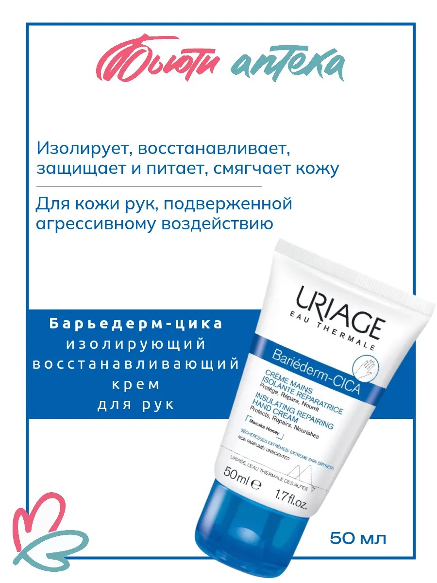Uriage bariederm hand cream offers reliable protection for dry and vulnerable skin. This product contains polymers that form an insulating, water-repellent layer on the skin's surface, protecting hands from cold, wind, water, and chemicals. Caring ingredients soothe, soften, nourish, and restore dry skin, promoting rapid healing of wounds and cracks. Uriage bargederm hand cream is insulating, leaves no sticky film on the skin, and is quickly absorbed.