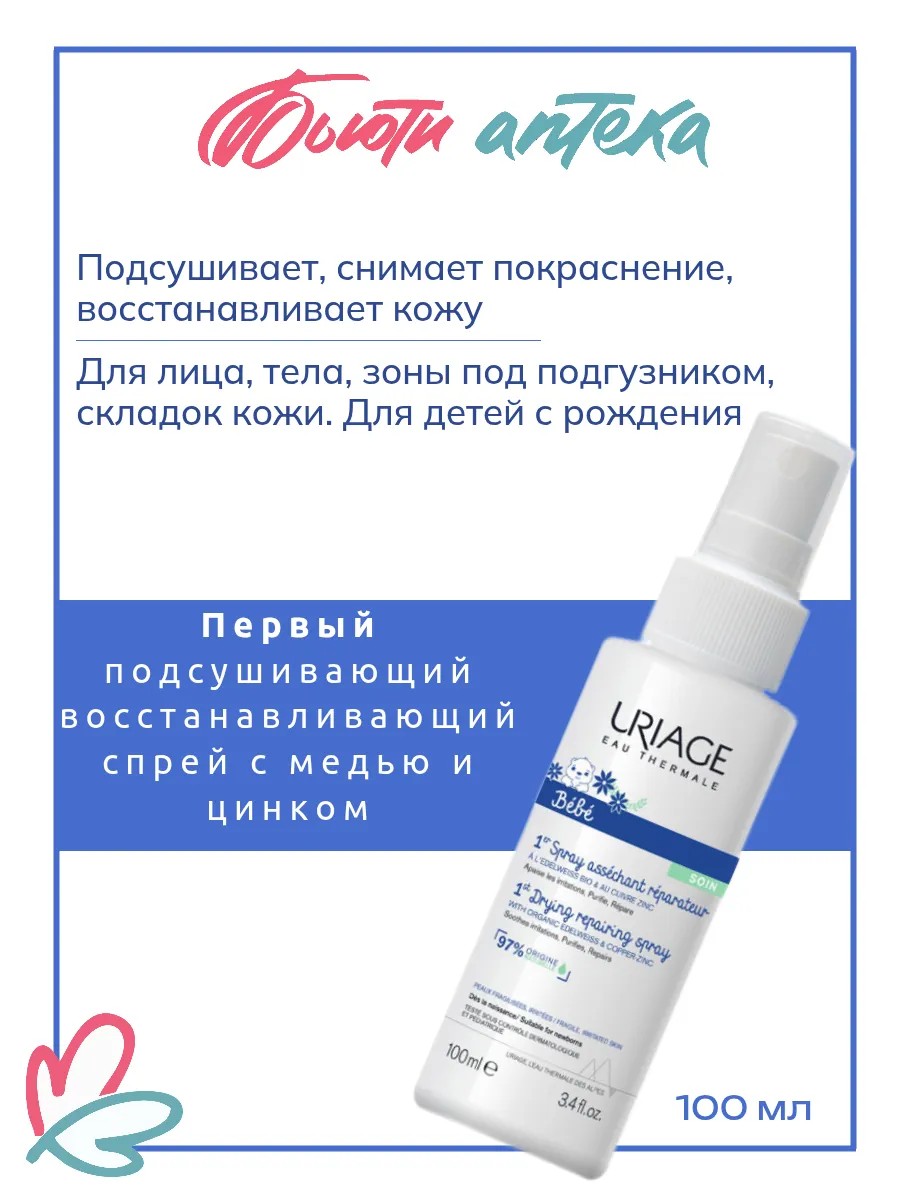 Uriage Bebe 1er spray Cu-Zn+ (Урьяж Бебе Первый Спрей Cu-Zn+ для детей и новорожденных) для раздраженной кожи, чувствительной, склонной к атопии. Быстрая помощь для поврежденной кожи с мокнущими участками от Урьяж - Первый Спрей Cu-Zn+.Легкая эмульсия в формате спрея, обогащенная медью (Cu) и цинком (Zn), обладает дезинфицирующим, оздоравливающим и успокаивающим свойствами. Средство быстро снимает покраснение и дискомфорт, восстанавливает целостность кожи. Смектит в составе формулы впитывает излишки влаги, подсушивает влажные, сочащиеся участки и кожные складки. Uriage Bebe 1er spray Cu-Zn+ обладает высокой переносимостью, подходит для чувствительной и склонной к атопии кожи с первых дней жизни. Средство прошло тестирование под дерматологическим и педиатрическим контролем. Активные компоненты технология TLR2-Regul + комплекс с термальной водой и органическим экстрактом эдельвейса обеспечивает успокаивающий эффект, снимает раздражение; смектит впитывает излишнюю влагу и посушивает мокнущие участки; глюконат меди и цинка имеют антибактериальные и оздоравливающие свойства, регулируют бактериальную флору. 97% натуральных ингредиентов. Без отдушек.