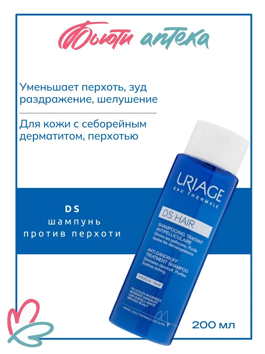 Лаборатория Урьяж выпустила первую серию шампуней с термальной водой французских Альп. Эффективная формула Uriage DS Hair Shampooing Traitant Antipelliculaire совмещает противогрибковые, противовоспалительные, увлажняющие и себорегулирующие компоненты. Шампунь глубоко очищает и оздоравливает кожу головы, устраняет умеренную сухую и жирную перхоть, уменьшает жирность волос и вероятность повторного появления перхоти. Волосы становятся гладкими и блестящими, легко расчесываются, исчезает зуд кожи и раздражение. Ультракомфортная текстура Шампуня Урьяж DS против перхоти хорошо пенится, имеет легкий свежий аромат.