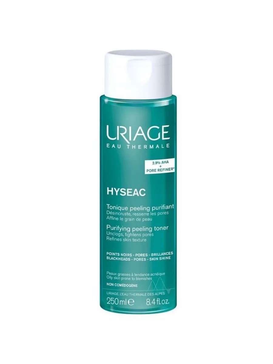 Uriage Hyseac Tonique Peeling Purifiant Лосьон-пилинг против несовершенств, разработанный для комбинированной, жирной и проблемной кожи, склонной к акне, черным точкам и расширенным порам. Формула с АНА-кислотами, экстрактом лакричника и термальной водой Uriage мягко отшелушивает, регулирует себум, очищает поры и выравнивает текстуру кожи, сохраняя ее увлажненной и успокоенной. Продукт гипоаллергенен, некомедогенен и подходит для ежедневного ухода за кожей с несовершенствами.