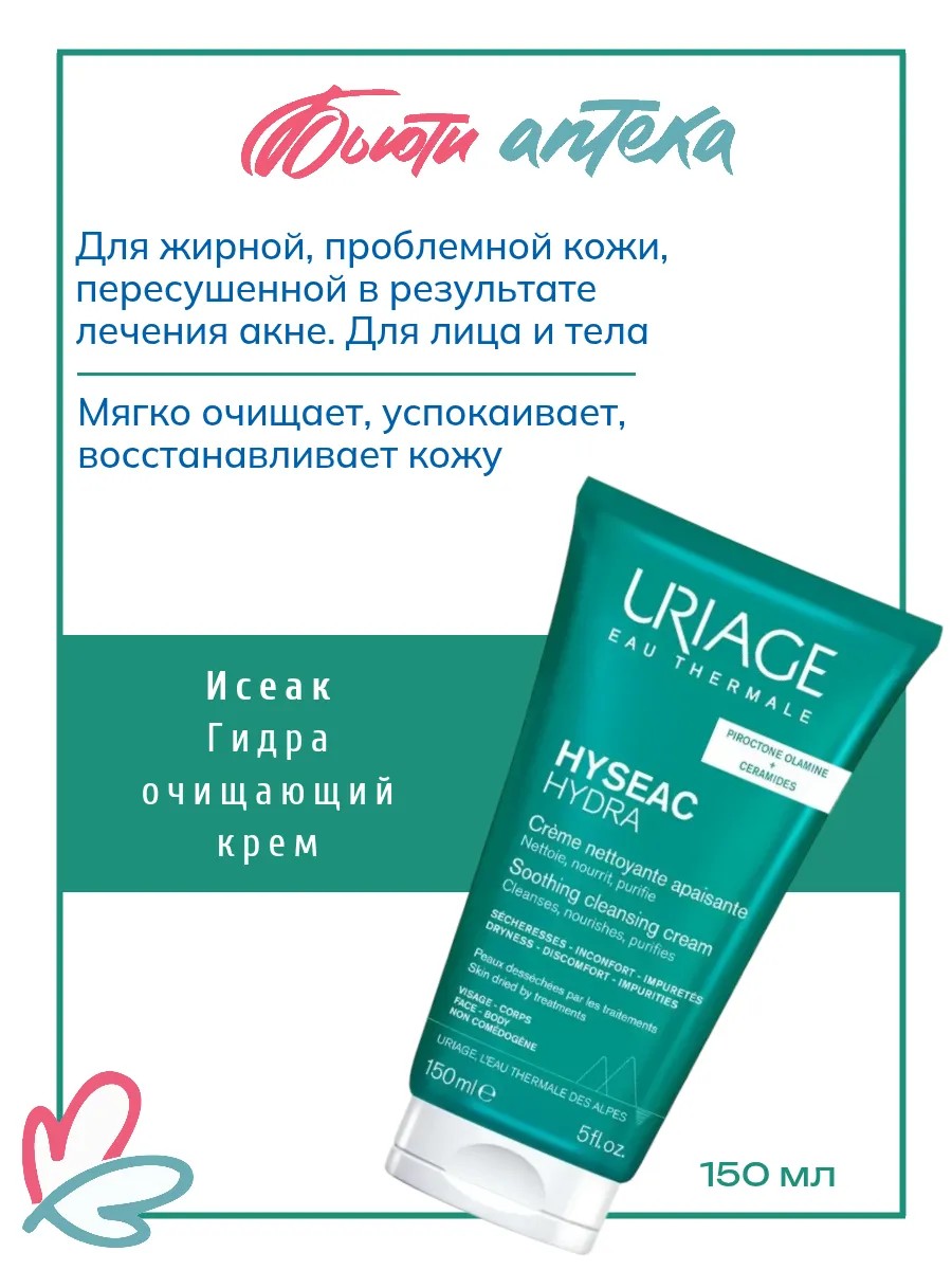 Гипоаллергенный очищающий крем Урьяж Исеак Гидра с легким ароматом разработан для мягкого очищения жирной кожи, которая раздражена или обезвожена в результате воздействия внешних факторов. Средство характеризуется высокой переносимостью и может использоваться для ежедневной гигиены эпидермиса. При регулярном использовании Hysèac Hydra Crème Nettoyante кожа становится матовой, гладкой, исчезает раздражение и проявления обезвоженности. Продукт не нарушает физиологический pH рогового слоя. Крем может использоваться для очищения кожи лица, шеи, области груди и спины. Активные компоненты: мягкая очищающая база, усиленная пироктоном оламином, бережно удаляет загрязнения, жирный блеск и подавляет развитие патогенной микрофлоры; термальная вода Урьяж увлажняет, защищает, интенсивно успокаивает раздраженную кожу; запатентованный комплекс Cerasterol-2F и глицин снимают раздражение, реструктуризируют, восстанавливают эпидермис. без мыла гипоаллергенно некомедогенно