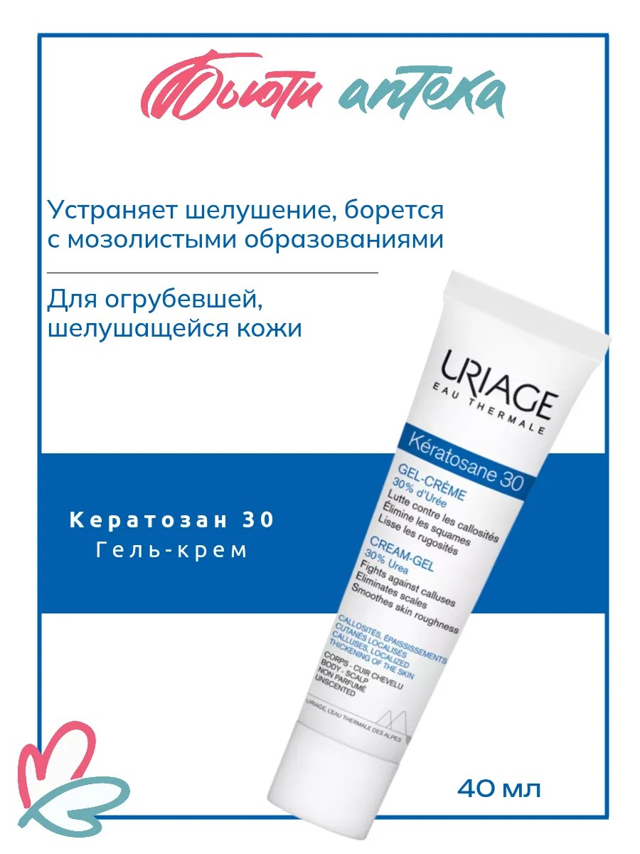 Uriage Keratosane 30 Localized thickened skin callosities (URIAGE, Кератозан 30 Гель для локализованных утолщений кожи) для сухой чувствительной кожи. Соединяет в своем составе активные вещества-кератолитики, успокаивающие и увлажняющие компоненты для устранения десквамации (шелушения) кожи и эффективной борьбы с мозолистыми образованими, которые характеризуются значительным утолщением кожи, нарушающим структуру рогового слоя. Насыщенная эмульсия геля-крема легко впитывается, не оставляя жирного налета. Без ароматизаторов и парабенов.