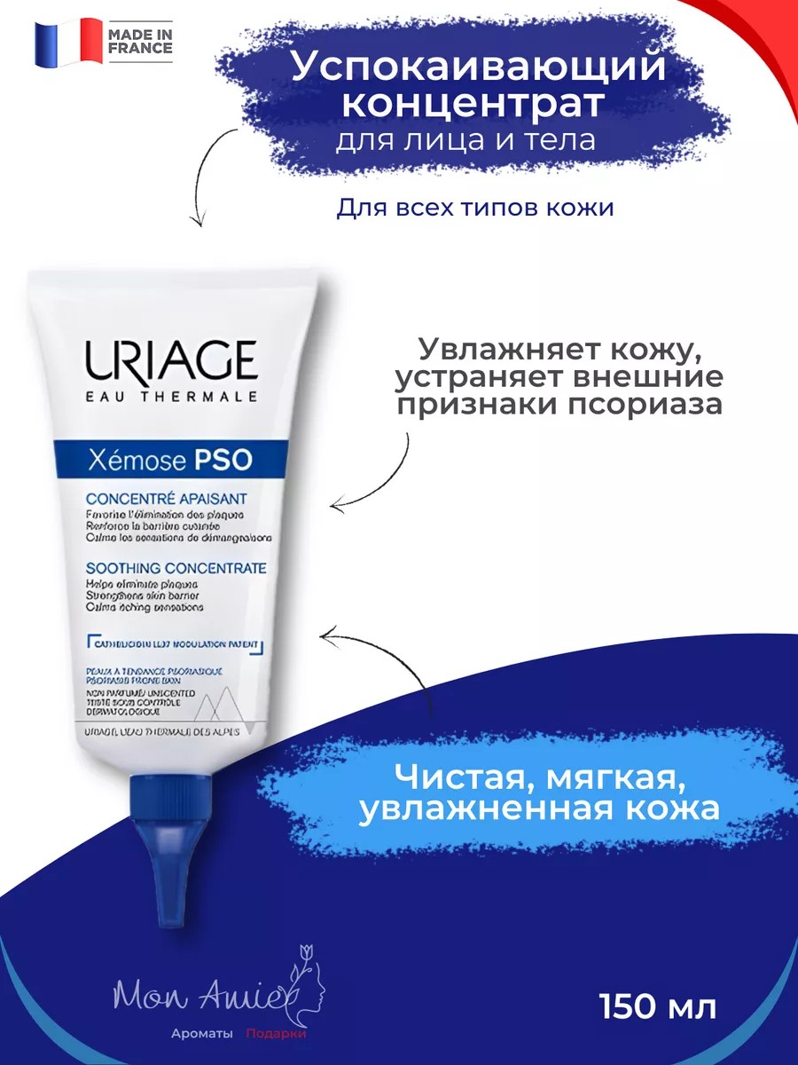 Xemose PSO Успокаивающий концентрат, успокаивает зудящие ощущения и укрепляет кожный барьер, сочетая термальную воду Uriage и два дерматологических патента. Протестировано под дерматологическим контролем, доказанная эффективность на коже с склонностью к псориазу: способствует удалению бляшек на 90%