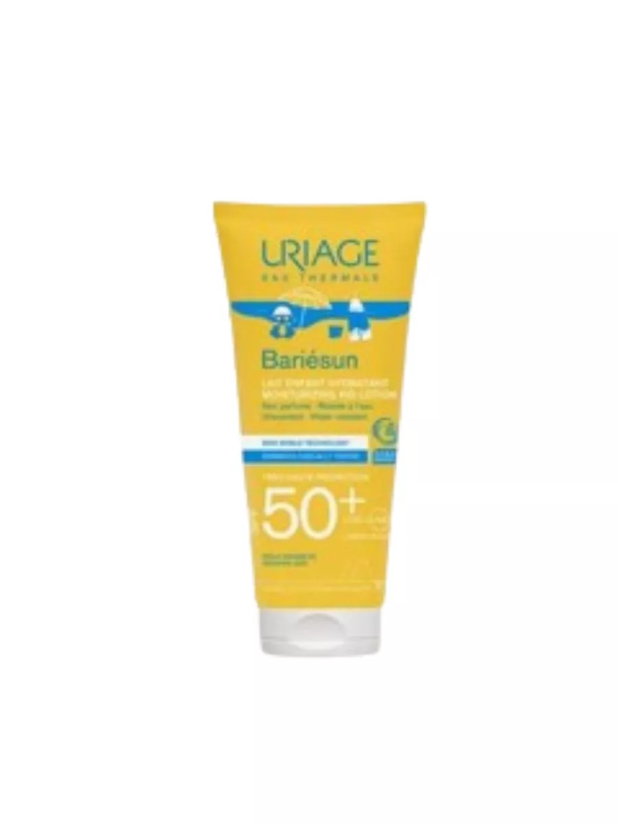 Uriage Bariesun SPF50+ Lait enfants (Урьяж Барьесан Молочко солнцезащитное для детей SPF50+) для чувствительной кожи детей. Увлажняющее молочко Урьяж Барьесан SPF50+ предназначено для чувствительной детской кожи лица и тела с 4х летнего возраста. Защищает от УФ-лучей, синего света и свободных радикалов. Интенсивно увлажняет и предотвращает обезбоживание кожи, вызванное длительным пребыванием на солнце. Молочко легкое, с нежирной текстурой, приносит удовольствие при применении, легко наносится и невидимый на коже. Фотостабильная формула с очень высоким уровнем защиты. Клинические исследования в течение 21 дня показали:100% мягкая и эластичная кожа, быстрое впитывание; 91% невидимый финиш. Активные компоненты: патент Telomeres комплекс фильтров против синего света и ультрафиолетового излучения; трегалоза, глицерин и глюкоза удерживают влагу в коже, оказывают увлажняющее действие; термальная вода Uriage увлажняет, успокаивает и защищает кожу. Фотостабилен, водоустойчив, без отдушек, без парабенов, без спирта, гипоаллергенно, некомедогенно.