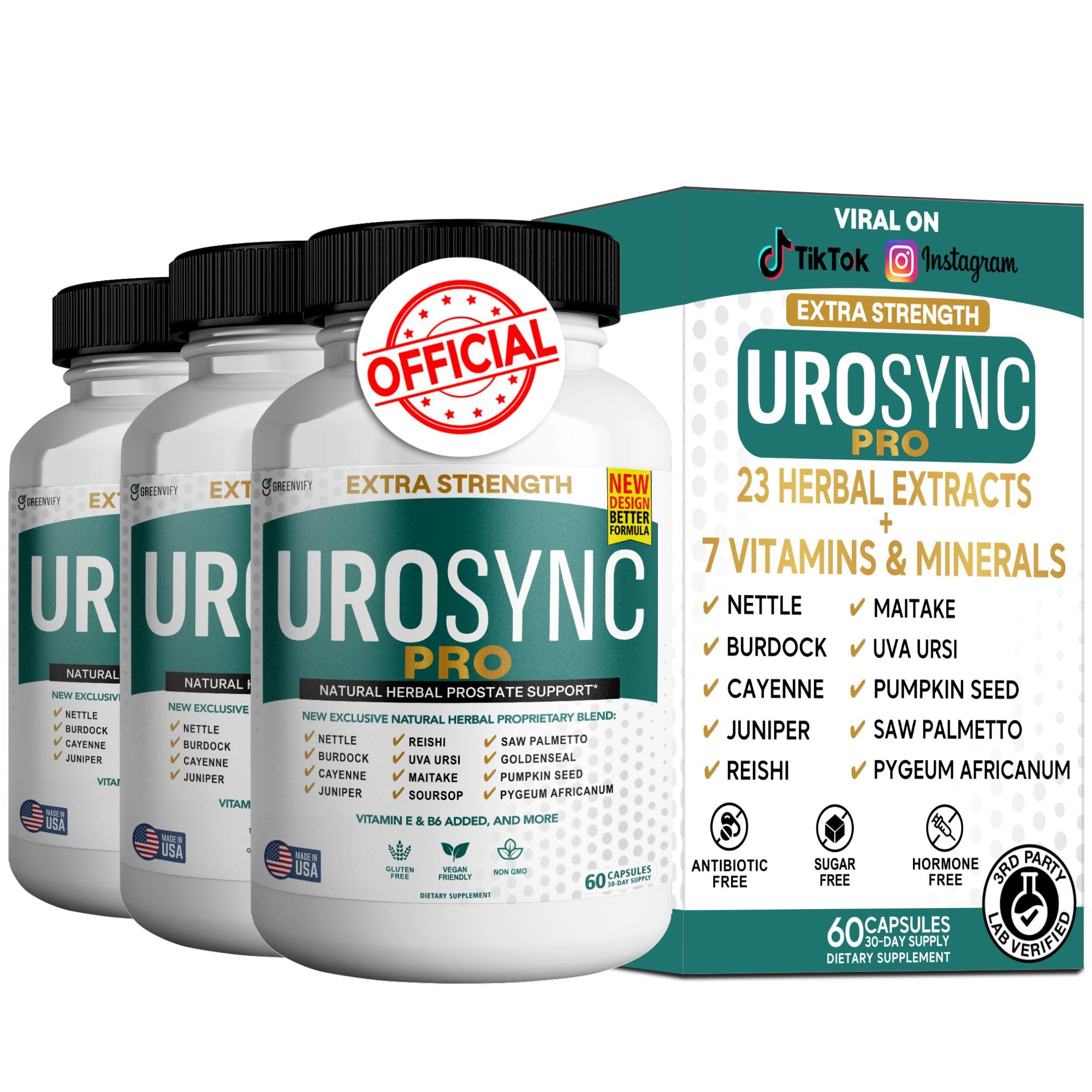 Support your prostate health with GreenVify UroSync Pro, a premium formula designed to help maintain prostate function and overall wellness. With a potent blend of natural ingredients such as Saw Palmetto, Pygeum, Reishi, and Cayenne, UroSync Pro offers the support you need for optimal prostate health. Herbal Blend: This formula combines powerful herbs like Nettle, Burdock, Maitake, and Soursop, all known for their potential prostate benefits. These ingredients work together to promote healthy prostate function. Added Nutrients: Along with the herbal blend, UroSync Pro includes Vitamin E, Vitamin B6, Zinc, and Selenium for added support and overall wellness. Vegan Gluten-Free: UroSync Pro is crafted to meet your dietary needs. It's vegan-friendly, gluten-free, and non-GMO, so you can enjoy the benefits without compromise. Each bottle contains 60 capsules, providing a full 30-day supply to support your health journey. Whether you're looking to improve prostate function or maintain overall wellness, UroSync Pro is here to help.60 Capsules - 30 Day Supply: Each bottle contains 60 capsules, providing a full 30-day supply of prostate health support. Vegan Gluten-Free: This formula is vegan-friendly, gluten-free, and non-GMO, making it suitable for various dietary preferences and restrictions. Enhanced Nutrient Formula: Enriched with Vitamin E, Vitamin B6, Zinc, and Selenium to complement the herbal blend for improved vitality and wellness. Exclusive Herbal Blend: Featuring a powerful mix of herbs including Nettle, Burdock, Maitake, and Soursop to promote prostate function and overall health. Prostate Health Support: UroSync Pro provides natural herbal support for prostate health with key ingredients like Saw Palmetto, Pygeum, Reishi, and Cayenne.