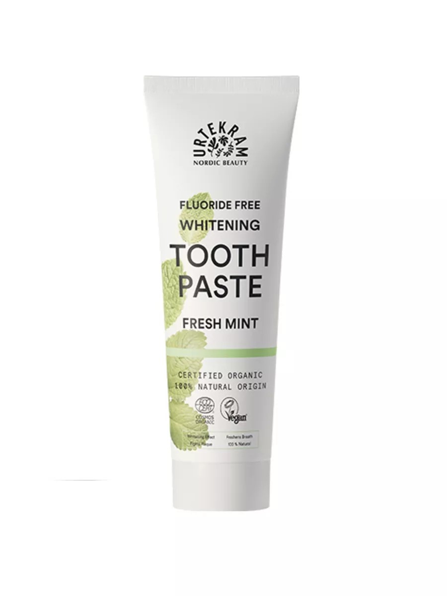 Whitening toothpaste Refreshing mint, Urtekram The paste does not contain fluoride additives, preservatives, SLS. It has a whitening effect, protects against caries, removes plaque, fights gum inflammation, freshens breath, restores the microbiome, strengthens tooth enamel. 100% natural 20% organic ingredients by volume 60% organic ingredients excluding water and minerals ECOCERT COSMOS ORGANIC certified. Packaging is made from >50% sugarcane.
