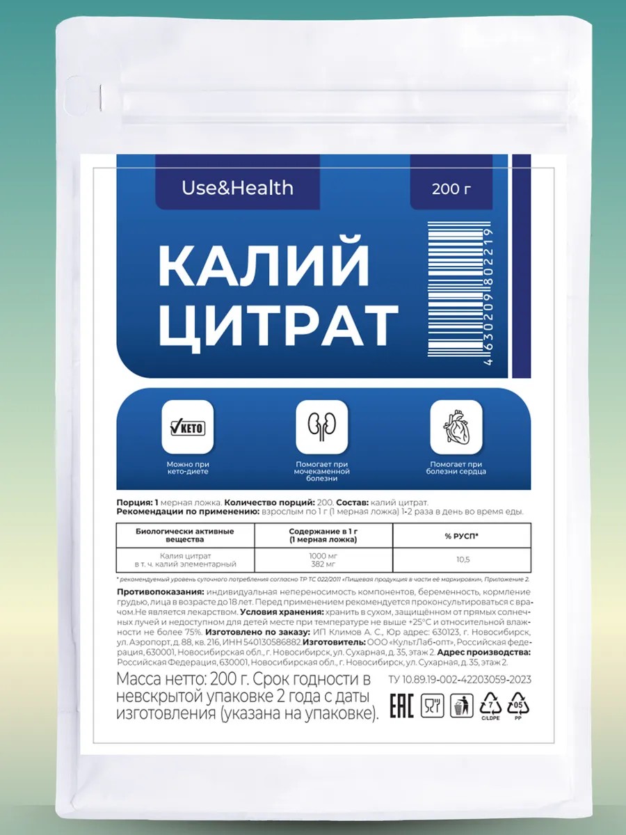 Potassium Potassium is a mineral, one of the electrolytes in the body. Most of it is located inside cells, ensuring their functioning. The trace element plays an important role in the formation and function of nerve and muscle tissue. Every cell needs potassium, because it maintains water-salt balance - the amount of water the cell can retain depends on potassium. Potassium is also involved in the functioning of the nervous system - transmission of nerve impulses; regulates heart contractions. Potassium promotes mental clarity, improves oxygen supply to the brain, acts as an immunomodulator, and helps normalize blood pressure. This vitamin is indispensable on the KETO diet; the supplement helps normalize metabolism, remove excess fluid from the body, thereby reducing swelling. Potassium citrate or Potassium Citrate is the most absorbable form of potassium. The dietary supplement has a wide range of effects in the body: regulates heart function; helps eliminate the negative effects of consuming large amounts of salty foods; reduces the risk of cardiovascular diseases; helps maintain an alkaline environment in the body; increases bone density; Supports kidney and adrenal function; lowers blood pressure; reduces the risk of coronary heart disease and stroke; strengthens muscles; improves metabolism; reduces the likelihood of allergic reactions; helps reduce swelling; regulates water balance. This halal-compliant food supplement does not contain gluten, titanium dioxide, or other harmful substances. Potassium citrate is suitable for men and women, including the elderly, and is an ideal gift for birthdays, New Years, and any other occasion.