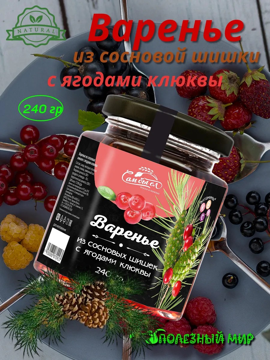 Варенье из сосновых шишек с ягодами клюквы "Полезный мир" – это уникальное сочетание природных вкусов, предлагающее не только изысканный вкус, но и богатый питательный состав. Это цукаты из сосновой шишки, приготовленные без использования ГМО, усилителей вкуса и ароматизаторов, что делает его особенно ценным для здорового питания.