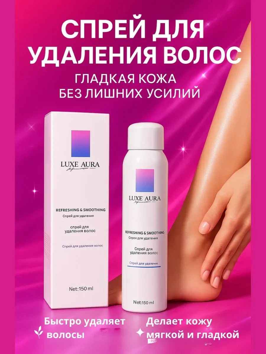 Спрей для удаления волос LUXE AURA — это современное и удобное средство, которое поможет быстро и безболезненно избавиться от нежелательных волос на теле. Забудьте о болезненных процедурах и неприятных ощущениях — благодаря мягкой формуле уход за кожей становится максимально комфортным. Спрей подходит для женщин и мужчин, обеспечивает гладкость кожи и свежесть на длительное время. Средство для депиляции в виде спрея легко наносится и равномерно распределяется по коже, проникая к корням волос и эффективно растворяя их. После применения кожа остаётся мягкой, увлажнённой и ухоженной. В отличие от бритвы, которая может вызывать раздражение и вросшие волосы, спрей работает бережно, не травмируя кожу. Это идеальный вариант для тех, кто ищет депиляцию без боли и неприятных последствий. Универсальный формат позволяет использовать спрей для удаления волос на ногах, руках, спине и в зоне подмышек. Благодаря удобной форме флакона объёмом 150 мл его легко взять с собой в дорогу, отпуск или на дачу. Компактный размер и безопасная крышка делают хранение удобным. Многие покупатели выбирают именно этот спрей, так как он совмещает эффективность и мягкий уход. Он подходит для чувствительной кожи и помогает надолго сохранить ощущение гладкости. Регулярное применение замедляет рост новых волос, что позволяет дольше наслаждаться результатом. Спрей для депиляции без боли станет отличной альтернативой салонным процедурам и дорогим услугам. Теперь удаление волос в домашних условиях стало ещё проще. Ключевые запросы: спрей для удаления волос, средство для депиляции, депиляция без боли, средство для чувствительной кожи, женская депиляция, мужская депиляция, удаление волос на ногах и руках, уход за кожей, быстрое удаление волос, гладкая кожа надолго.