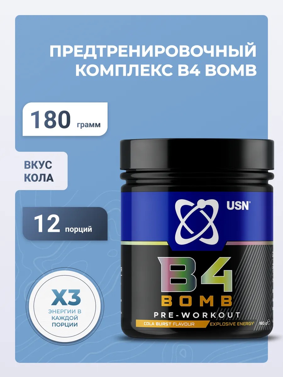 USN B4-BOMB - это бодрящее предтренировочное средство, разработанное для того, чтобы помочь вам получить максимальную отдачу от каждой тренировки и достичь поставленных целей. Испытайте взрывную энергию с USN B4 Bomb pre workout. Разработано с научной точки зрения для повышения вашей энергии и концентрации во время тренировки.
