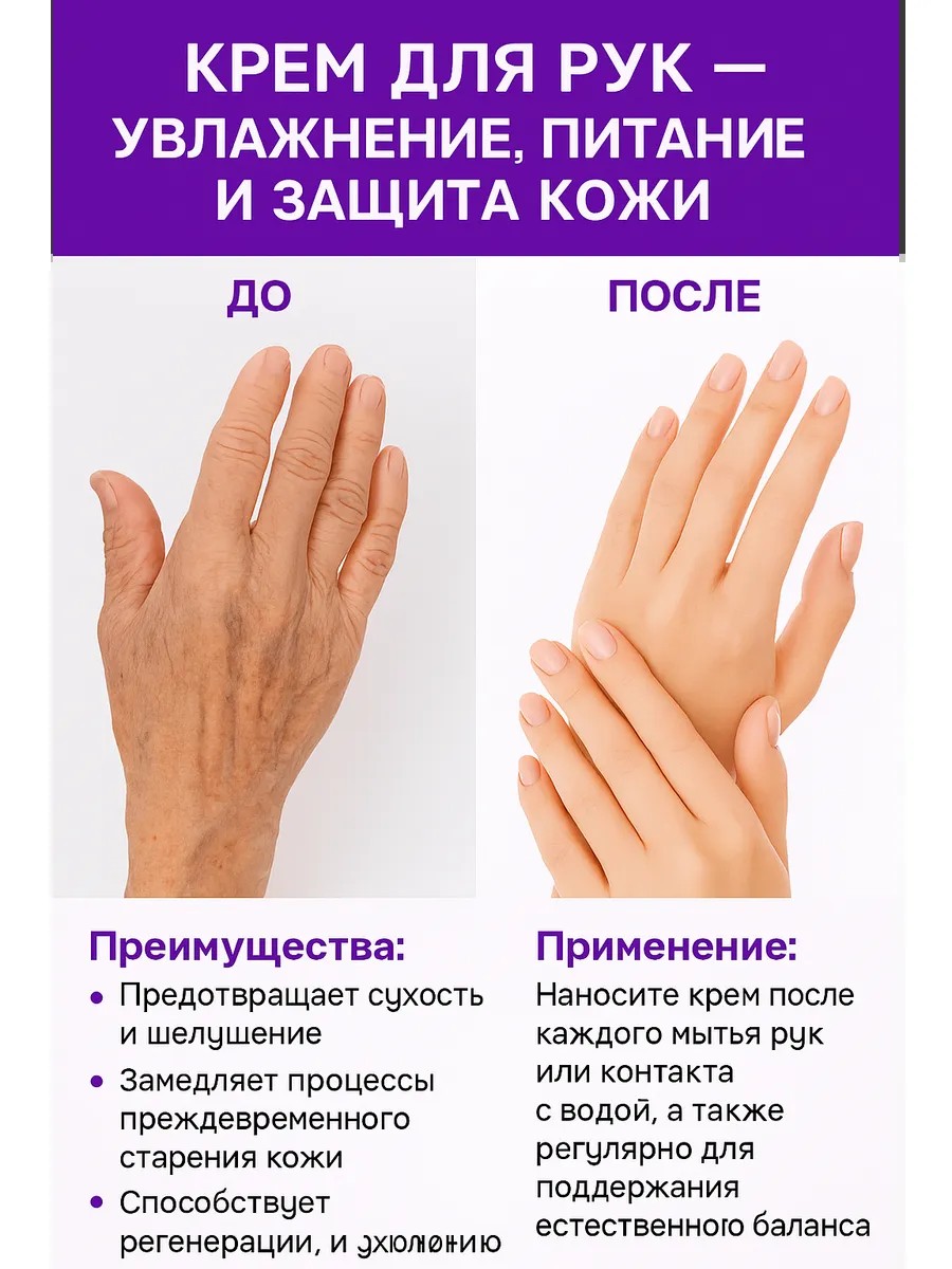Преимущества: Регулярное использование крема для рук помогает предотвратить сухость, шелушение, преждевременное старение кожи и способствует ее регенерации.