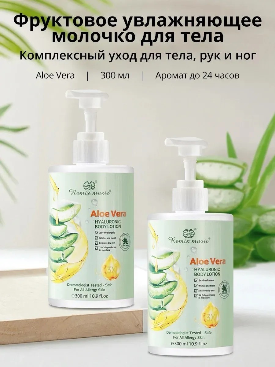 Remix Music Aloe Vera Hyaluronic Body Lotion — это увлажняющий лосьон для тела с алоэ вера, гиалуроновой кислотой и коллагеном. Он глубоко питает и смягчает сухую кожу, делает её более упругой и сияющей, подходит даже для чувствительной кожи.