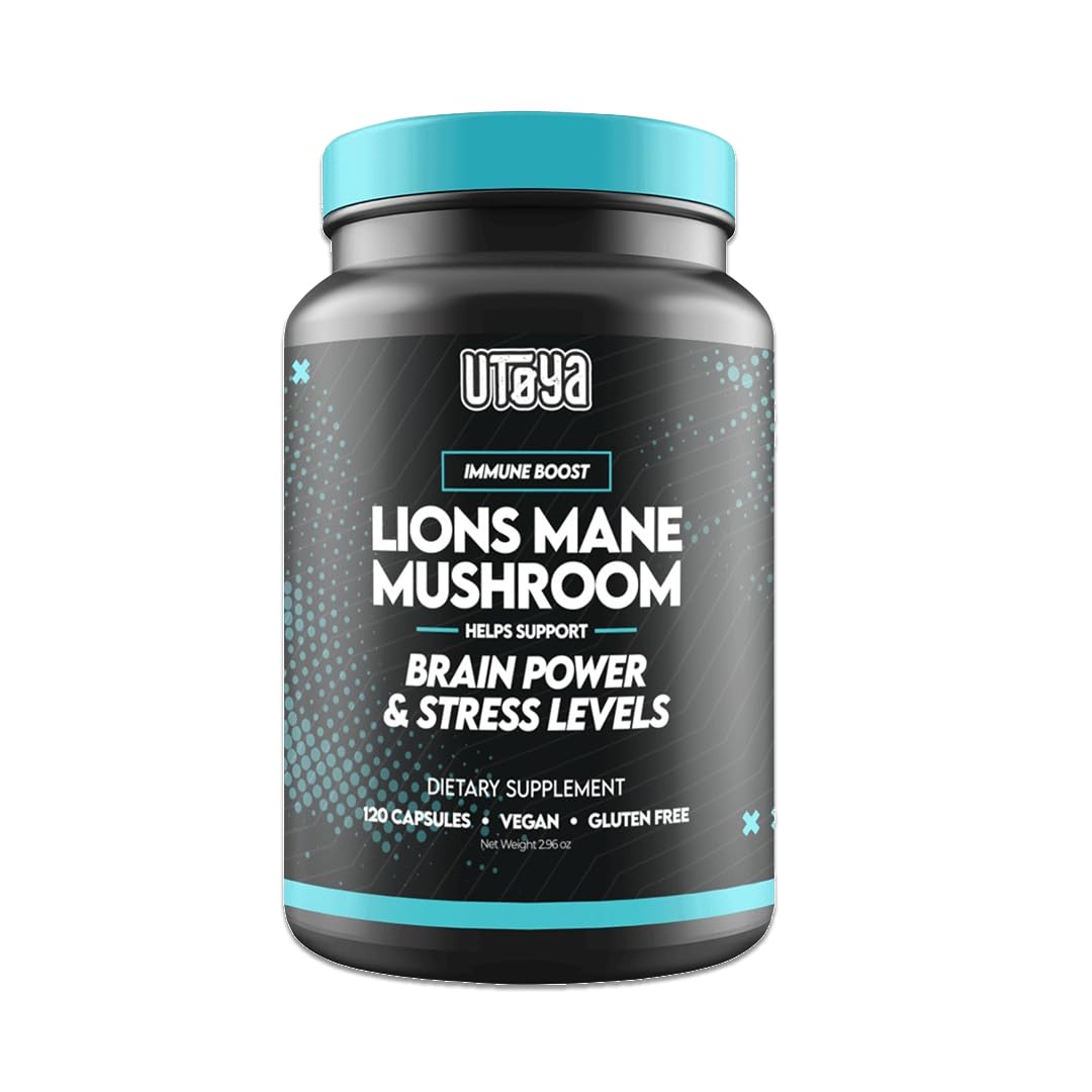UTOYA Lions Mane Supplement Capsules - Gluten Free/Vegan Mushroom Supplements for Brain Power Stress Relief Mental Clarity and Calm - Non- GMO Immune Support Supplements - 120 Capsules