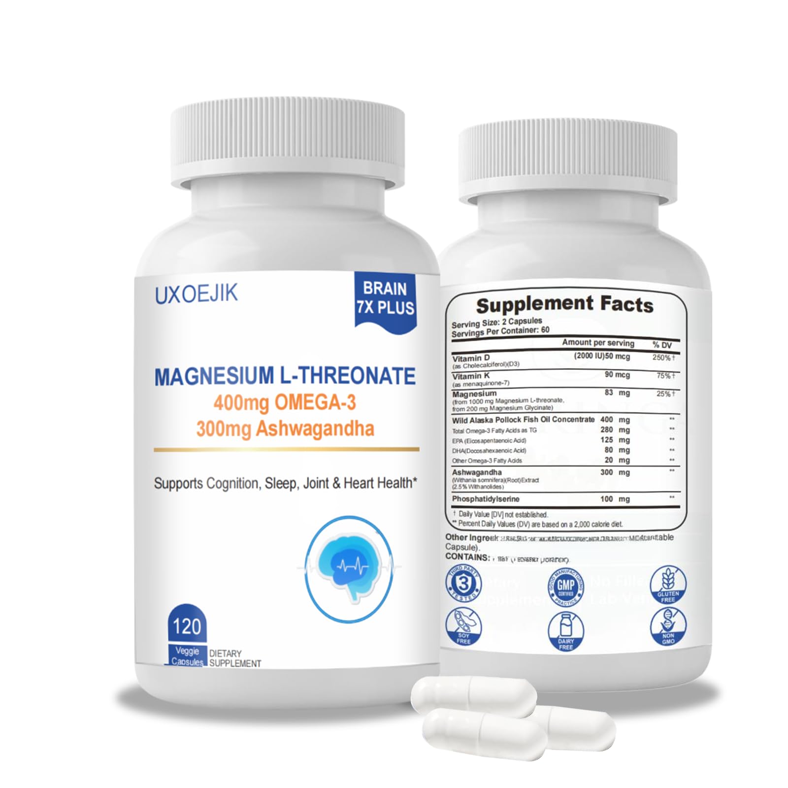 Lifetime Satisfaction Guarantee: We're so confident you'll feel the UXOEJIK difference, we offer a no-questions-asked refund — forever. Your vitality journey starts risk-free today!. Simple Daily Routine for Foundational Support: For optimal foundational support, take two easy-to-swallow capsules daily (one serving). This convenient 60-day supply is designed to be easily incorporated into your daily wellness regimen to help maintain overall cognitive and nervous system health. Pure, Potent Third-Party Verified Quality: Our capsules are rigorously tested for purity and potency. They are non-GMO, gluten-free, soy-free, vegan, and free from artificial additives. Each batch is independently tested to confirm it is free from heavy metals (like lead and mercury) and microbial contaminants. Promotes Relaxation Calm for Daily Wellness: Our unique Neuro-Mag blend combines Magnesium L-Threonate with adaptogenic herbs like Ashwagandha. This formulation is designed to help the body manage the effects of daily stress and promote a sense of calm and relaxation, contributing to overall well-being. Advanced Formula with Magnesium L-Threonate: This supplement features highly bioavailable Magnesium L-Threonate, a form known for its ability to cross the blood-brain barrier and support overall brain and nervous system health. Enriched with Vitamins D and K2 to aid in nutrient absorption and cellular wellness.