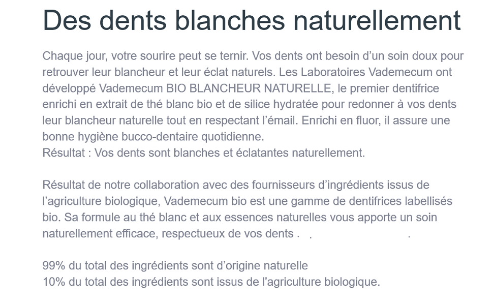 Vademecum Bio Natural Whitening Toothpaste with organic white tea extract and mild mint flavor. INGREDIENTS Aqua (Water, Eau) Sorbitol Hydrated Silica PEG-32 Sodium Lauryl Sulfate Cellulose Gum Aroma (Flavor) Sodium Monofluorophosphate Panthenol Sodium Fluoride Magnesium Sulfate Disodium Phosphate Sodium Saccharin Glycerin Calcium Glycerophosphate Trisodium Phosphate Zinc Sulfate Sodium Sulfate Propylene Glycol Sodium Chloride Manganese Sulfate Echinacea Purpurea Root Extract Melissa Officinalis Leaf Extract Salvia Officinalis (Sage) Leaf Extract Thymus Vulgaris (Thyme) Extract Chamomilla Recutita (Matricaria) Flower Extract Sodium Benzoate Lactic Acid Benzyl Alcohol Potassium Sorbate Limonene CI 77891 (Titanium Dioxide)99 of the total ingredients are of natural origin. Vegan formula. Provides natural and effective care for teeth. Designed to restore the natural whiteness of teeth while respecting enamel. With organic white tea extract and a mild mint flavor. Dentifrice Vademecum Bio Blancheur Naturelle à l'extrait de Thé blanc bio et au goût de Menthe douce. INGRÉDIENTS Aqua (Water, Eau) Sorbitol Hydrated Silica PEG-32 Sodium Lauryl Sulfate Cellulose Gum Aroma (Flavor) Sodium Monofluorophosphate Panthenol Sodium Fluoride Magnesium Sulfate Disodium Phosphate Sodium Saccharin Glycerin Calcium Glycerophosphate Trisodium Phosphate Zinc Sulfate Sodium Sulfate Propylene Glycol Sodium Chloride Manganese Sulfate Echinacea Purpurea Root Extract Melissa Officinalis Leaf Extract Salvia Officinalis (Sage) Leaf Extract Thymus Vulgaris (Thyme) Extract Chamomilla Recutita (Matricaria) Flower Extract Sodium Benzoate Lactic Acid Benzyl Alcohol Potassium Sorbate Limonene CI 77891 (Titanium Dioxide)99 du total des ingrédients sont d'origine naturelle. Formule végane. Apporter un soin naturel et efficace aux dents. Conçu pour restaurer la blancheur naturelle des dents tout en respectant l'émail. A l'extrait de Thé blanc bio et au goût de Menthe douce.
