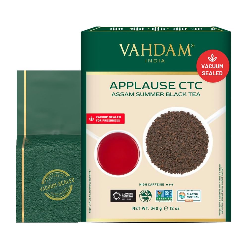 WE CARE FOR PEOPLE AND THE PLANET - We are now proudly a Carbon Neutral Plastic Neutral certified brand. We measure our global carbon and plastic footprint and offset it through our investments in environmental sustainability initiatives in India. ETHICAL, DIRECT FAIR TRADE - Our innovative supply chain model ensures you enjoy the freshest cup of tea while also offering our farmers a better price for their product. 1 of our revenue goes directly towards the education of our farmers' children through our Teach ME social campaign. A BRAND WITH A BILLION DREAMS - VAHDAM India is one of the world's largest digitally native brands in India, delivering to over 3 million customers in more than 130 countries. With the aim of offering the finest teas, brewing products, spices, and herbs from India to consumers worldwide under a local and sustainable label, with a strong commitment to people and the planet. DIRECT FROM PREMIUM PLANTATIONS - Discover the finest whole-leaf tea, sourced from top-tier Indian plantations. Vacuum-sealed and packaged within 24 to 72 hours of harvest, it delivers a fresh garden aroma and taste. Enjoy 100 pure tea, packaged in a 3-layer, moisture-resistant, resealable bag for lasting freshness. Preparation: 2g loose leaves 200ml water at 100 C 3 to 5 minutes. INDIA'S GIFT TO THE WORLD - Experience the quintessence of strength and vibrancy in our Applause CTC Assam Black Tea. This premium loose-leaf tea is made from pure CTC second-flowering leaves, sourced from the finest estates in Upper Assam at the height of summer. With a high caffeine content, it's the perfect choice for your morning ritual. Enjoy it plain or with milk, as you prefer.