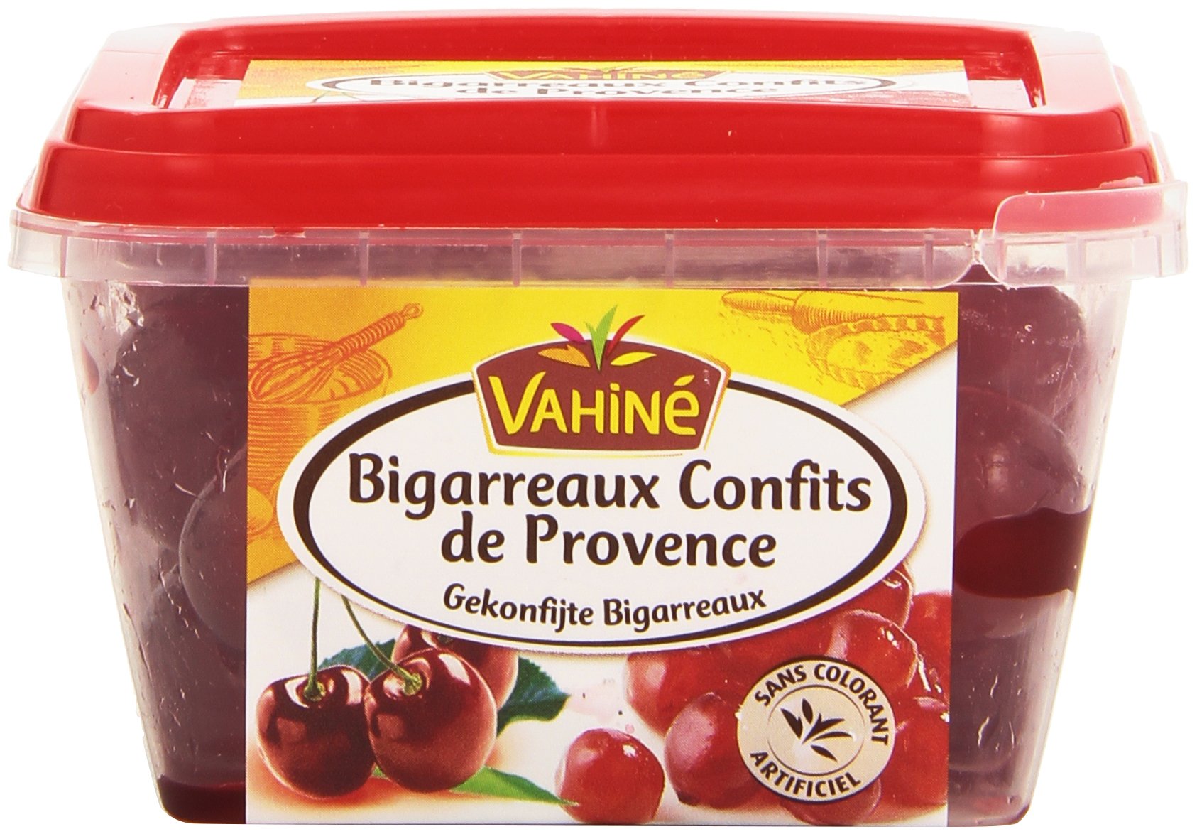 Ingredients: cherries, sugar, acidity regulator: citric acid, preservatives: potassium sorbate, SULFUR DIOXIDE, colour: carmines.Ingrédients bigarreaux, sucre, correcteur d'acidité : acide citrique, conservateurs : sorbate de potassium, ANHYDRIDE SULFUREUX, colorant : carmins.Vahiné Bigarreaux Confits de Provence 150 g