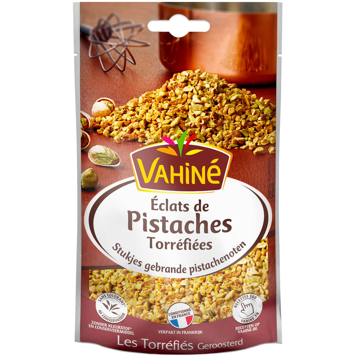 Over 40 years of Vahiné pastry expertise. Vahiné has rigorously selected these California pistachios for their intense flavor. Their delicious aroma, intensified by roasting, will bring finesse and character to your desserts. Storage: This product has been packaged in a protective atmosphere. After opening, we recommend resealing the bag, storing it in a cool, dry place, and consuming it within 15 days. INGREDIENTS Roasted pistachios. May contain other tree nuts. No artificial colors or preservatives.