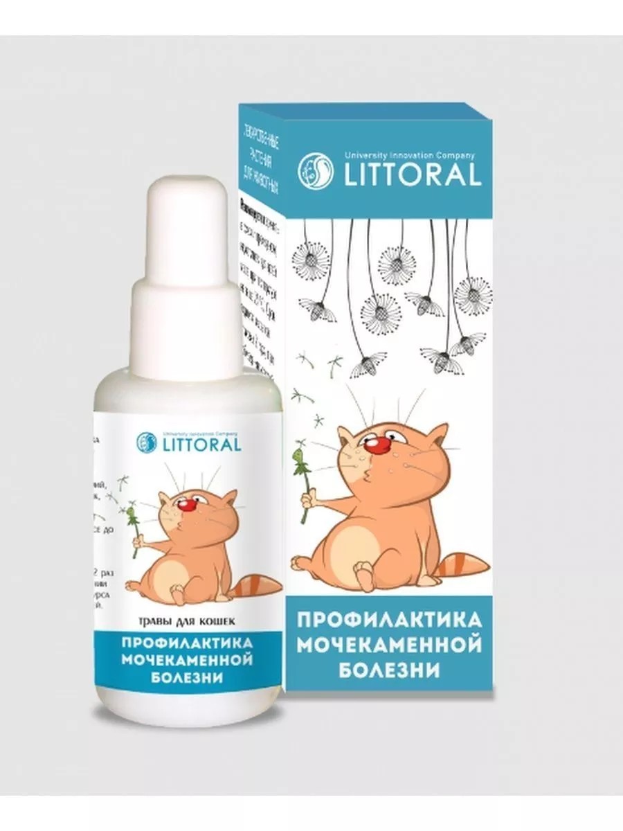 The vitamin tincture for cats "Urolithiasis Prevention" prevents the formation of sand and stones in the urinary system and improves water and salt balance. It is especially important for neutered animals and those on dry food. Ingredients: bearberry, immortelle flowers, knotweed, fucus, dandelion, cudweed, burdock herb, corn silk, and flaxseed. Simply add one capful to the food twice daily for 20 days. A preventative course requires four bottles.