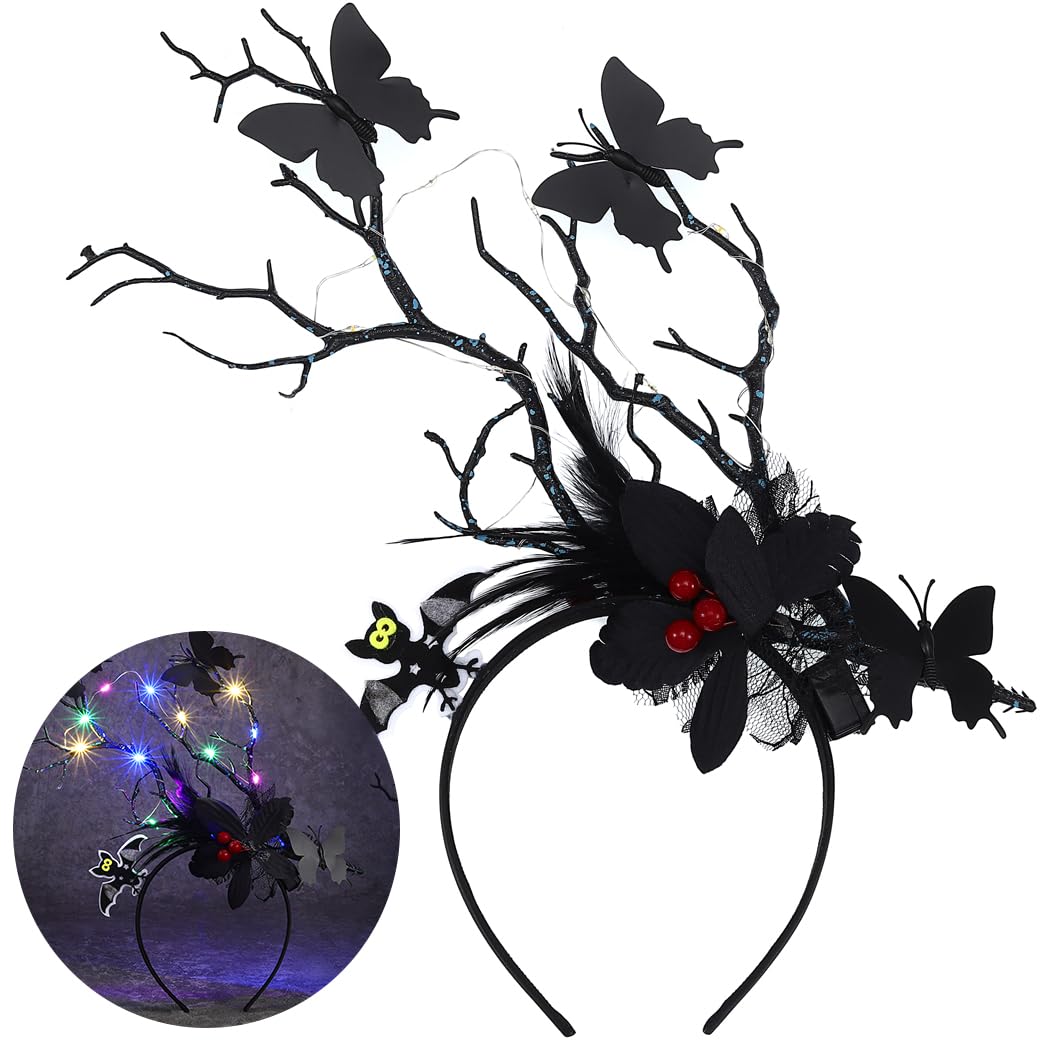 Vakkery Light Up Halloween Headband LED Antler Headbands Gothic Butterfly Hair Band Halloween Cosplay Costume Party Hair Accessories for Women