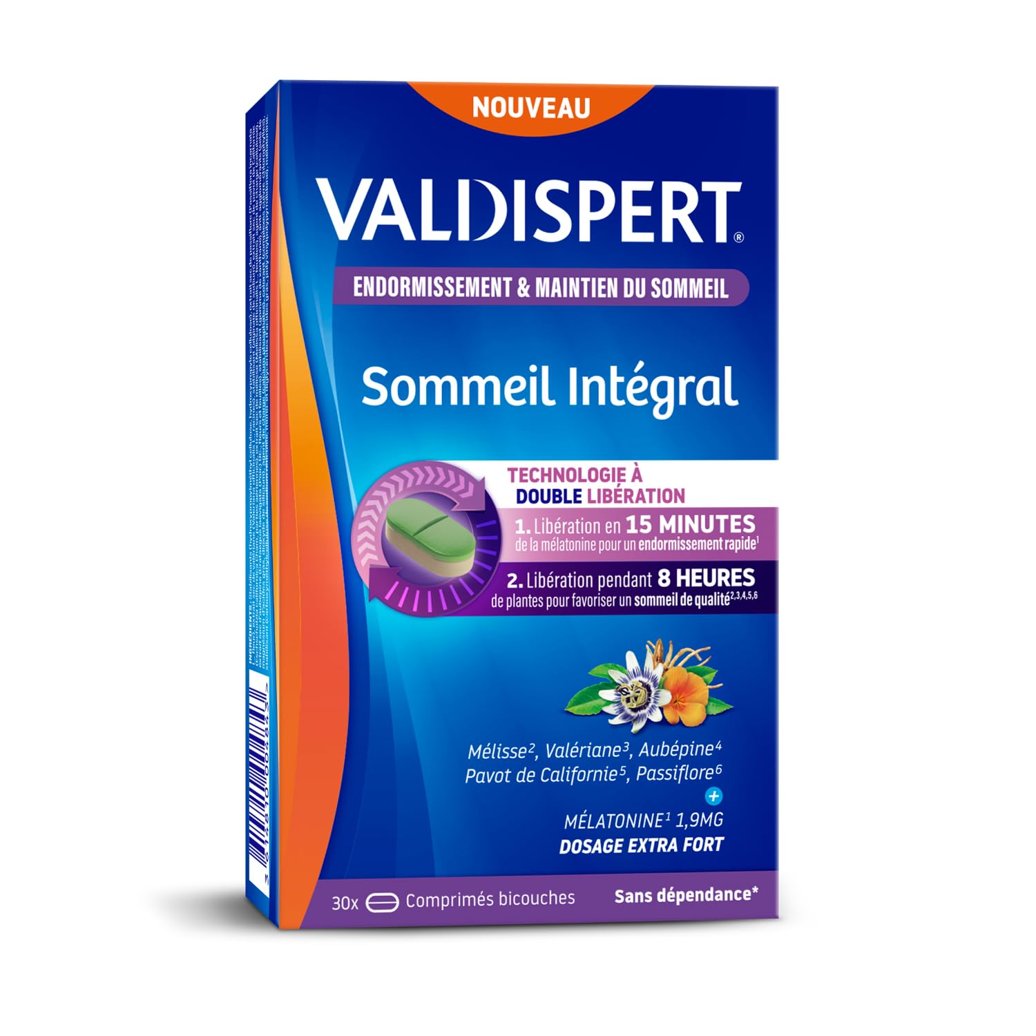 This food supplement is part of the Valdispert Asleep1 Sleep Maintenance range: products specially designed to help you fall asleep and stay asleep by limiting nighttime awakenings. Its two-layer tablet promotes quality sleep thanks to its double release technology: 1. The first layer releases 1.9 mg of melatonin in 15 minutes to help reduce the time it takes to fall asleep1. 2. The second layer releases a mixture of plants for 8 hours to help you not wake up in the middle of the night2,3,4,5,6. Valdispert Sommeil Intégral is a product of the highest quality: it contains vegan ingredients, and is lactose and gluten-free. It is without known dependence or addiction at recommended doses. Melatonin1 1.9 mg: helps reduce the time it takes to fall asleep. The effect is obtained by taking at least 1 mg of melatonin when going to sleep. Melissa2 extract: helps with optimal nighttime relaxation and contributes to the quality of your sleep. Valerian3: Helps maintain natural sleep. Hawthorn4: Helps reduce restlessness and allows for better sleep. California Poppy5: Promotes quality sleep. Passionflower6: Promotes good sleep. INGREDIENTS Stabilizers (hydroxypropylmethyl cellulose, hydroxypropyl cellulose), dry extract of passionflower (Passiflora incarnata L., flower), dry extract of valerian (Valeriana officinalis L., roots), stabilizer (sodium alginate), dry extract of California poppy (Eschscholzia californica Cham, aerial parts), dry extract of lemon balm (Melissa officinalis L., leaves), bulking agent (cellulose), extract dried hawthorn (Crataegus laevigata (Poir.) DC., flowers and leaves), stabilizer (xanthan gum), anti-caking agents (magnesium salts of fatty acids, silicon dioxide), bulking agent (calcium phosphates), coloring (copper-chlorophyll complexes), stabilizer (crosslinked sodium carboxymethylcellulose, mono-and diglycerides of fatty acids, polyvinylpolypyrrolidone), melatonin. DIRECTIONS FOR USE To be used in case of: - Difficulty falling asleep - Nocturnal awakenings 1 tablet to take with a glass of water, 30 minutes before bedtime. SAFETY WARNING Do not exceed the recommended daily dose. Occasional use. Keep out of reach of children. Store in a dry place, away from light and TAKE BACK CONTROL OF YOUR SLEEP: Valdispert, sleep specialist, offers tailor-made solutions, including the Sleep Sleep Maintenance sleep product range designed to help you fall asleep and maintain restful sleep. QUALITY COMMITMENT: Valdispert makes it a point of honor to develop quality sleep solutions. As a result, these supplements are formulated without gluten or lactose, from vegan ingredients and without artificial colors. No dependence or habit forming. SIMPLE USE: 1 tablet to be taken with a glass of water, 30 minutes before bedtime. Reserved for adults. 1 box 30 NIGHTS. ? REDUCE NIGHTTIME AWAKENINGS: EXTENDED RELEASE OVER 8 HOURS FOR QUALITY SLEEP: The second layer gradually releases a blend of 5 plants over 8 hours: valerian, hawthorn, California poppy and passionflower. It thus offers continuous support for uninterrupted and restorative sleep. FALL ASLEEP FAST: This sleep supplement is composed of 2 layers. The 1st layer releases an extra strong dosage of 1.9 mg of melatonin in 15 minutes, making it an effective solution for those looking to fall asleep faster. Ce complément alimentaire fait partie de la gamme Valdispert Endormissement1 Maintien du sommeil : des produits spécialement conçus pour vous aider à vous endormir et à rester endormi en limitant les réveils nocturnes. Son comprimé bicouche favorise un sommeil de qualité grâce à sa technologie double libération : 1. La première couche libère en 15 minutes 1,9 mg de mélatonine pour aider à réduire le temps d'endormissement1. 2. La seconde couche libère pendant 8h un mélange de plantes pour vous aider à ne pas vous réveiller en pleine nuit2,3,4,5,6. Valdispert Sommeil Intégral est un produit de la plus haute qualité : il contient des ingrédients vegan, et est sans lactose et sans gluten. Il est sans dépendance ni accoutumance connues aux doses recommandées. Mélatonine1 1,9 mg : aide à réduire le temps d'endormissement. L'effet est obtenu par la prise d'au moins 1 mg de mélatonine au moment d'aller dormir. Extrait de mélisse2 : aide à une relaxation nocturne optimale et contribue à la qualité de votre sommeil. Valériane3 : Aide à maintenir un sommeil naturel. Aubépine4 : Aide à réduire l'agitation et permet un meilleur sommeil. Pavot de Californie5 : Favorise un sommeil de qualité. Passiflore6 : Favorise un bon sommeil. INGRÉDIENTS Stabilisants (hydroxypropylméthyl cellulose, hydroxypropyle cellulose), extrait sec de passiflore (Passiflora incarnata L., fleur), extrait sec de valériane (Valeriana officinalis L., racines), stabilisant (alginate de sodium), extrait sec de pavot de Californie (Eschscholzia californica Cham, parties aériennes), extrait sec de mélisse (Melissa officinalis L., feuilles), agent de charge (cellulose), extrait sec d'aubépine (Crataegus laevigata (Poir.) DC., fleurs et feuilles), stabilisant (gomme de xanthane), anti-agglomérants (sels de magnésium d'acides gras, dioxyde de silicium), agent de charge (calcium phosphates), colorant (complexes cuivre-chlorophylles), stabilisant (carboxyméthylcellulose de sodium réticulée, mono-et diglycérides d'acides gras, polyvinylpolypyrrolidone), mélatonine. MODE D'EMPLOI À utiliser en cas de : - Difficultés à s'endormir - Réveils nocturnes 1 comprimé à prendre avec un verre d'eau, 30 minutes avant le coucher. AVERTISSEMENT DE SÛRETÉ Ne pas dépasser la dose journalière recommandée. Usage ponctuel. Tenir hors de portée des enfants. À conserver dans un endroit sec, à l'abri de la lumière et REPRENEZ LE CONTRÔLE DE VOTRE SOMMEIL : Valdispert, spécialiste du sommeil, offre des solutions sur mesure, dont la gamme produit pour dormir Endormissement Maintien Du Sommeil conçue pour aider à s'endormir et maintenir un sommeil