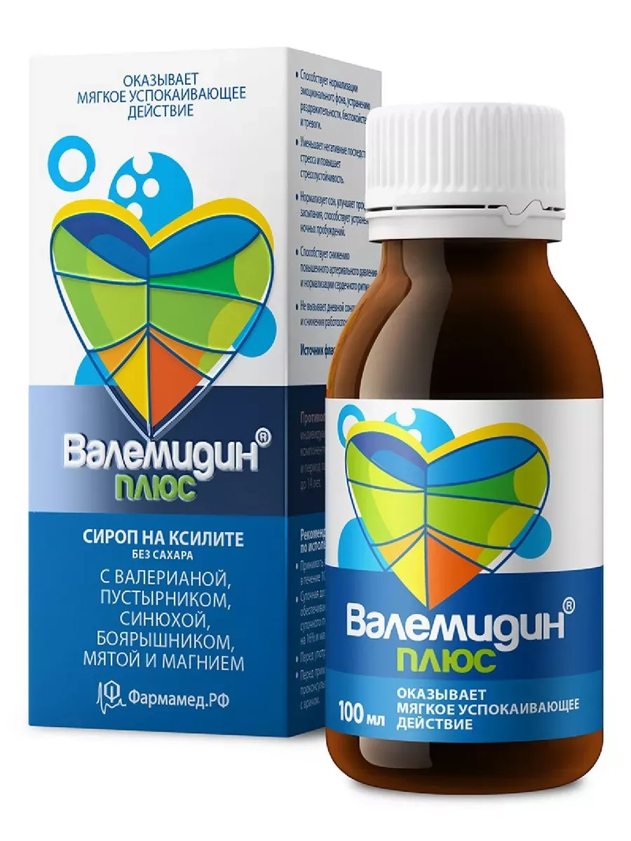 Валемидин плюс - сироп на ксилите с валерианой, пустырником, синюхой, боярышником, мятой.