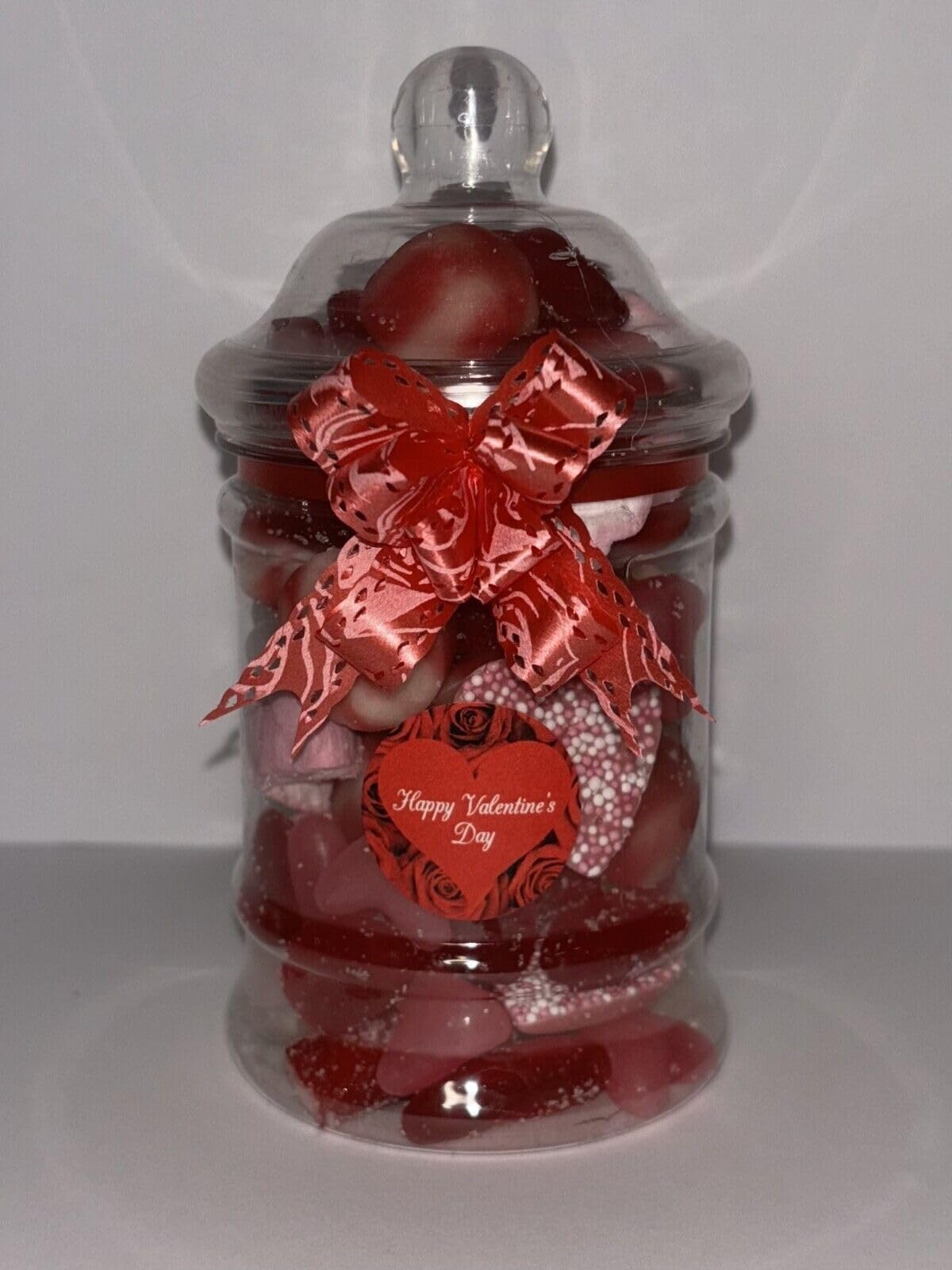 Will be loved by all ages. Filled with delicious pink red Love sweets. Pick n Mix style sweet jar. Happy Valentines Day.