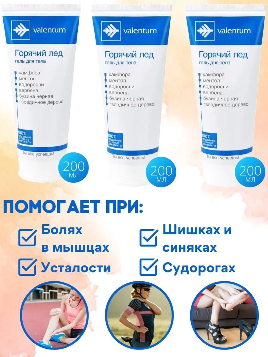 Гель мазь Valentum горячий лед снимает боль и усталость мышц. Обладает охлаждающим и противовоспалительным эффектом, существенно ускоряя естественную регенерацию тканей. Рекомендуется применять от усталости мышц ног - например, если вы весь день стоите на ногах или много ходите. Покажет себя отличным средством в качестве крема от боли в мышцах (мышечной боли) после тренировки, фитнеса в спортзале и занятий спортом. Мазь Горячий лёд также служит от синяков, гематом и ушибов, ускоряя срок их сведения. Также мазь поможет снять судорогу.Мазь содержит натуральные травы и масла: камфора, вербена, водоросли, ментол, бузина, гвоздичное дерево.Сделано в России.