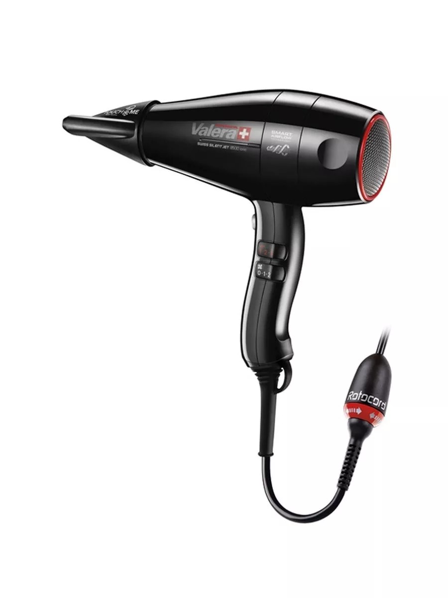 A powerful, ultra-quiet professional hair dryer from the Hospitality line. Recommended for medium-intensive use: in fitness clubs, gyms, and swimming pools. Equipped with a reliable AC motor with an average lifespan of approximately 2,000 hours. A safety thermostat shuts off the device if it overheats. The ion generator produces millions of negatively charged particles that allow hair shafts to absorb more moisture, restoring their natural moisture balance. Smart Airflow technology optimizes airflow, increasing its output (75 m3/h) while reducing the device's noise level (64 dB). Two professional narrow concentrator nozzles, one of which, Touch Me, does not heat up during operation, allow you to direct the airflow to individual strands of hair. The cord of this hair dryer is equipped with a unique Rotocord fastening that prevents it from twisting during operation. Power 2000 W. Made in Switzerland.