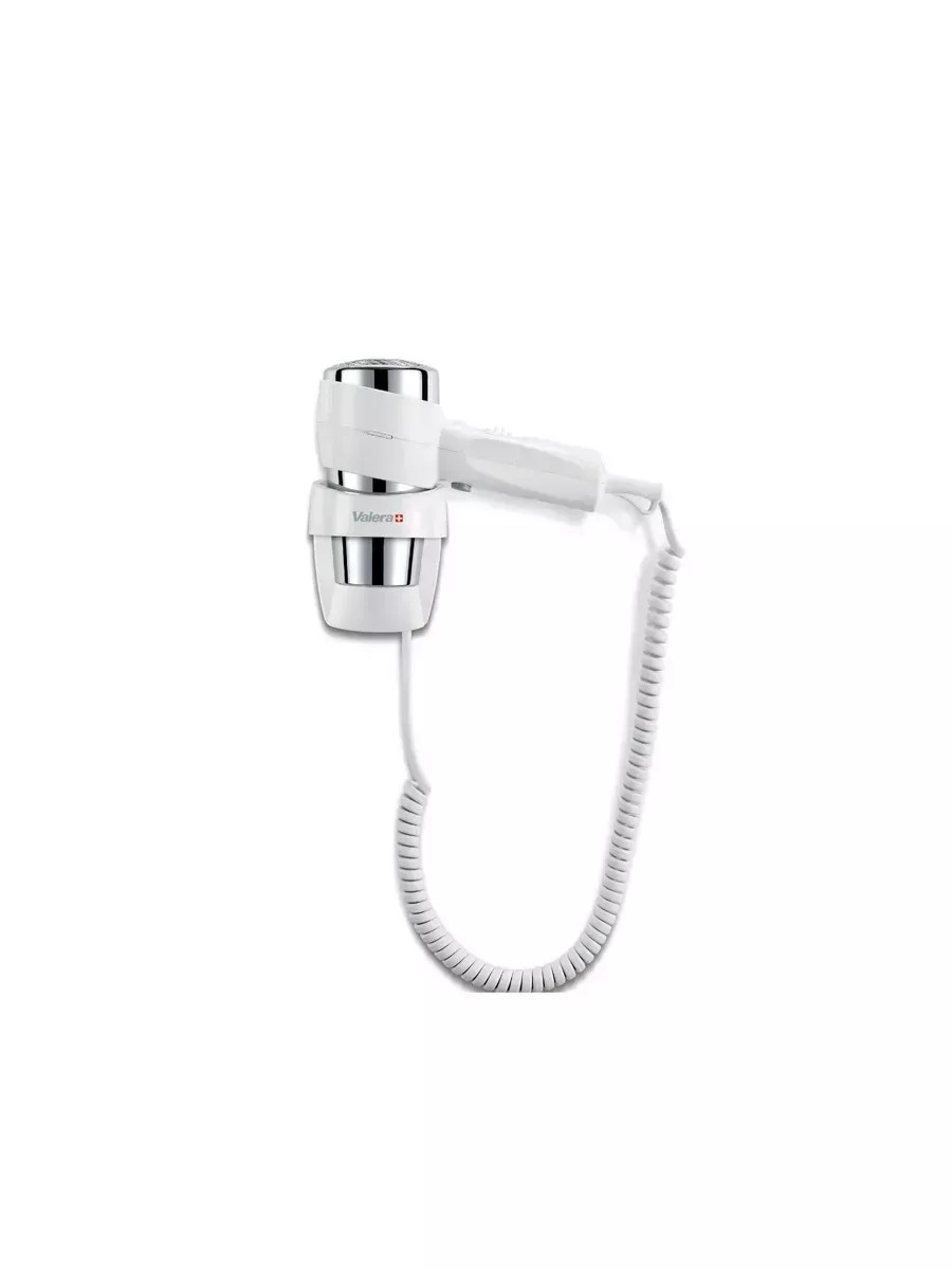 Hospitality series hair dryer with vertical wall mount. Connects directly to the power supply; no cord or plug is included. Recommended for installation in private bathrooms, hotel rooms, and motels. Operates only when the protective "Push" on/off button is pressed. The wall mount also has an on/off button (automatic switch). Overheat protection for safe operation. 3 temperature settings: Cool – cold air, low flow; 1 – warm air, low flow; 2 – hot air, high flow. No high-speed flow switch button. Concentrator nozzle included. Power 1800 W. Made in Switzerland.