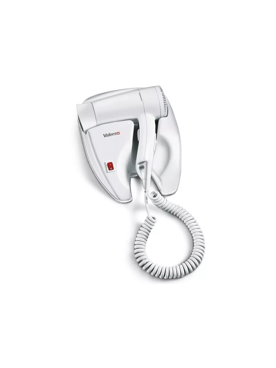 Hospitality series hairdryer in a classic white case with a stand for mounting in cabinets and drawers; wall mounting is not possible. Recommended for use in bathrooms and bedrooms of hotels, boarding houses, hostels, private homes, and ship cabins. The hairdryer features a triple safety system (thermostat with automatic reset + protective on/off button "Push" + wall mount safety switch), a long power cord, and smooth speed and temperature control. Dries hair quickly and gently. Made in Switzerland.