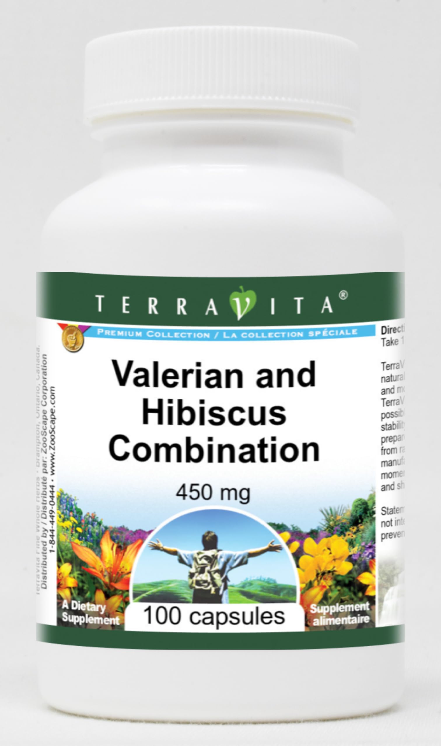 Valerian and Hibiscus Combination - 450 mg (100 capsules, ZIN: 513502) Packaged in the United States in a GMP certified facility (Good Manufacturing Practice). No fillers. Manufacturer: TerraVita Size: 100 capsules Easy-to-swallow Capsules in a sealed bottle. Ingredients: Gelatin, Water, Hibiscus Flower - 225 mg, Valerian Root - 225 mg