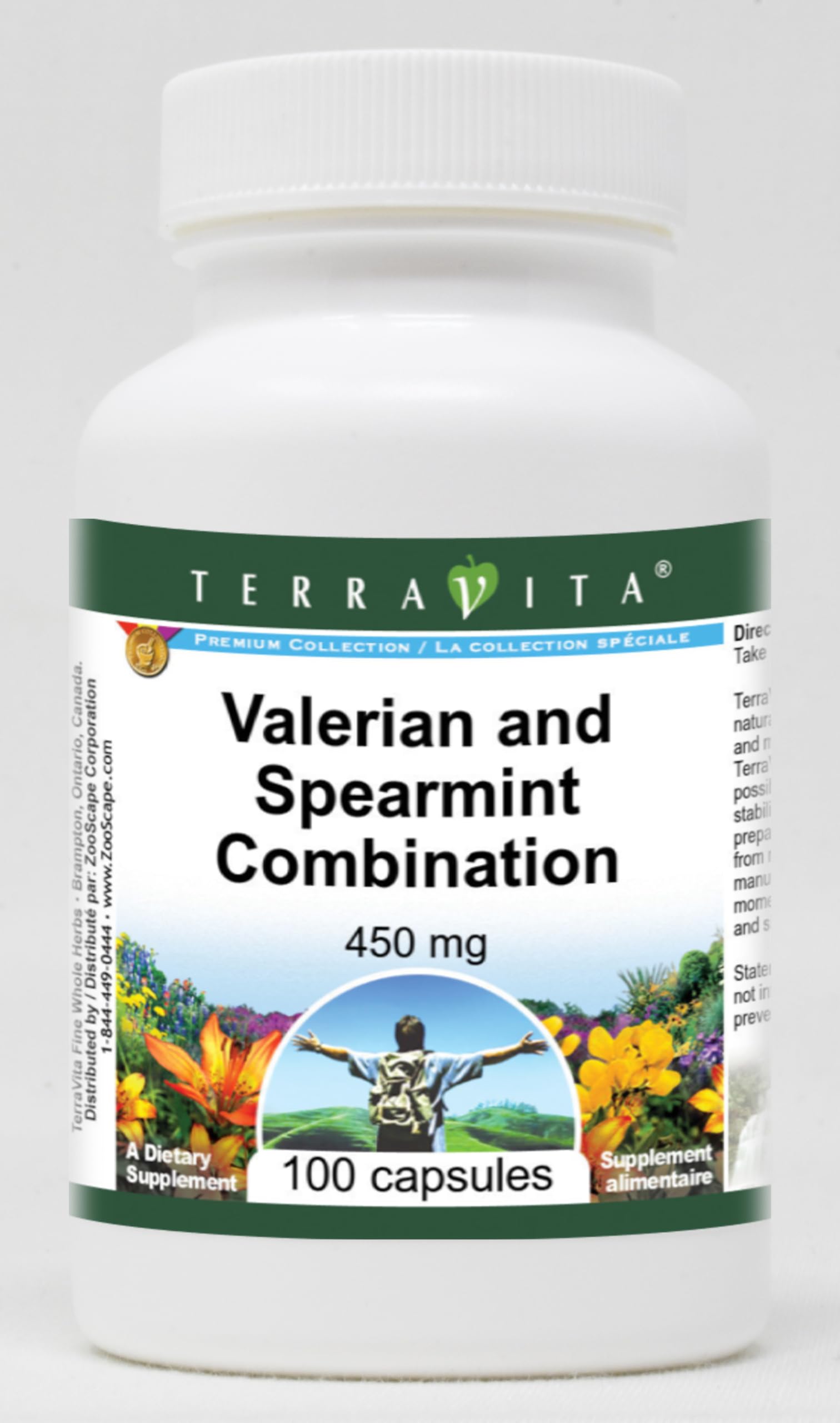 Valerian and Spearmint Combination - 450 mg (100 capsules, ZIN: 513462) Packaged in the United States in a GMP certified facility (Good Manufacturing Practice). No fillers. Manufacturer: TerraVita Size: 100 capsules Easy-to-swallow Capsules in a sealed bottle. Ingredients: Gelatin, Water, Spearmint Leaf - 225 mg, Valerian Root - 225 mg