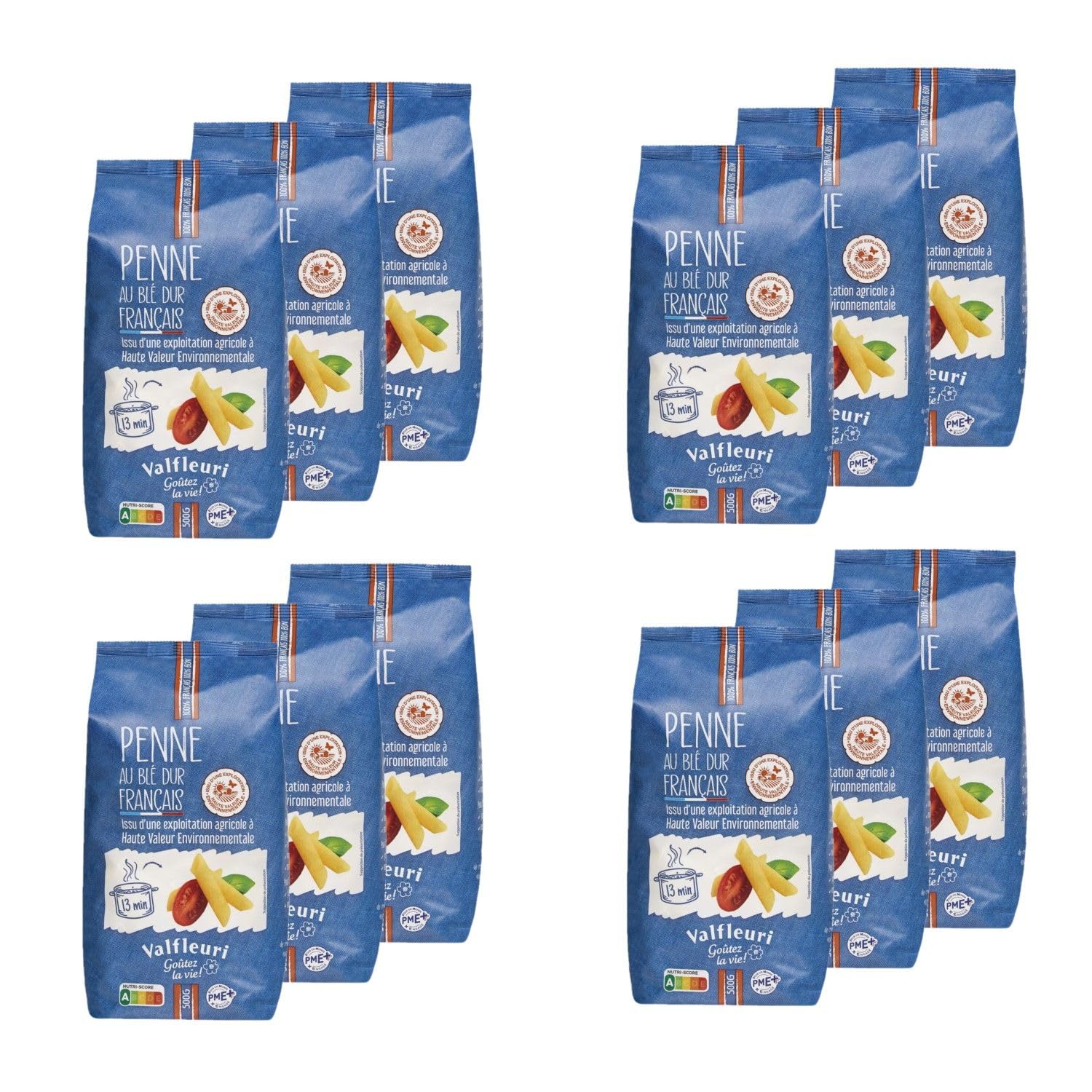 This pack contains 12 products described below: Good for you, good for nature! These 100 durum wheat Valfleuri Penne are the perfect partner for strong and spicy dishes, such as beef, tuna, sardines, garlic, and chili peppers. Thanks to their beveled cut and fine grooves, they hold sauces beautifully. Did you know? Valfleuri Penne are made with 100 French durum wheat from farms certified as High Environmental Value (HVE). This "HVE" label prioritizes a sustainable commitment to French farmers and the preservation of biodiversity and the land, thanks in part to reduced fertilizer, pesticide, energy, and water usage. Ingredients: High Environmental Value (HVE) durum wheat semolina, 100 French. May contain traces of egg. Allergens: Gluten Storage Instructions: Store at room temperature, away from heat and humidity, before opening. Cooking Instructions: Pour the pasta into a large volume of boiling salted water (1 liter of water per 100g of pasta). Cook for 13 minutes, stirring regularly during cooking. Drain thoroughly. Product Information: Net Weight: 500g Origin: France Energy: 1494kJ 352kcal Fat: 1.6g, of which saturates 0.4g Carbohydrate: 70g, of which sugars 3g Protein: 13g Dietary Fiber: 3g Salt: 0.01g Packaging: Plastic Bag Full details are available on the product packaging. The information on this page is for guidance only. We encourage you to read the information on the product label, especially regarding food allergies. SAFETY WARNING Full details are available on the product packaging. The information on this page is for guidance only. We encourage you to read the information on the product label, especially regarding food allergies.Lot 12x Pâtes - Gamme HVE "Penne" - Sachet 500gDESCRIPTION DU PRODUIT DESCRIPTION DU PRODUIT Ce lot contient 12 produits décrits ci-dessous : Bon pour vous, bon pour la nature ! Ces Penne 100 blé dur Valfleuri, sont l'allié des mets forts et épicés , bœuf, thon, sardines, ail, piment…Grâce à leur coupe biseautée et leurs fines rainures, ils accrochent bien les sauces. Le saviez-vous ? Les Penne Valfleuri sont élaborées avec 100 de blé dur français issu d'exploitations agricoles à Haute Valeur Environnementale. Ce « label HVE » privilégie un engagement durable auprès des agriculteurs français et la préservation de la biodiversité et de la terre grâce entre autres à moins d'engrais, moins de pesticides, moins d'énergie et d'eau utilisés. Ingrédients : Semoule de blé dur de qualité supérieure Haute Valeur Environnementale 100 France. Traces éventuelles d'œuf. Allergènes : Gluten Mode de conservation : A conserver à température ambiante, à l'abri de la chaleur et de l'humidité avant ouverture. Conseil d'utilisation : Versez les pâtes dans un grand volume d'eau bouillante salée. (1 litre d'eau pour 100g de pâtes). Laissez cuire 13 minutes en remuant régulièrement en cours de cuisson. Égouttez soigneusement Informations produit : Poids net : 500g Origine : France Energie : 1494KJ 352Kcal Lipides : 1,6g dont acides gras saturés 0,4g Glucides : 70g dont sucres 3g Protéines : 13g Fibres alimentaires : 3g Sel : 0,01g Emballage : Sachet en Plastique Détail complet et disponible sur l'emballage du produit. Les informations présentes sur cette page sont à titre indicatif. Nous vous invitons à prendre connaissance des informations sur l'étiquette du produit, en particulier concernant les allergies alimentaires. AVERTISSEMENT DE SÉCURITÉ Détail complet et disponible sur l'emballage du produit. Les informations présentes sur cette page sont à titre indicatif. Nous vous invitons à prendre connaissance des informations sur l'étiquette du produit, en particulier concernant les allergies alimentaires.