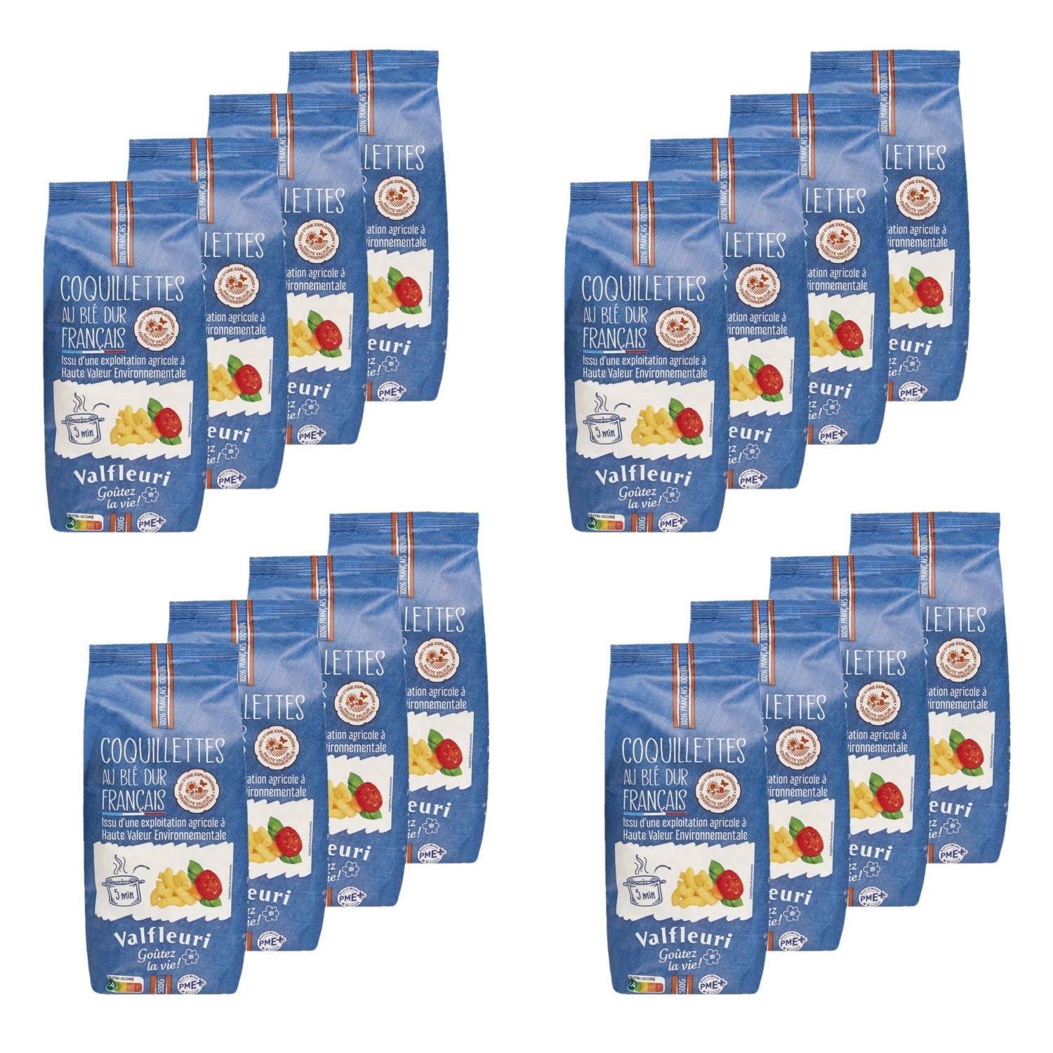 This pack contains 16 products described below: Good for you, good for nature! Valfleuri 100 durum wheat Coquillettes have a taste of childhood. Easy to enjoy every day with tomato sauce and a little cheese, they're also capable of creative feats. Everyone loves them! Did you know? Valfleuri Coquillettes are made with 100 French durum wheat from farms with High Environmental Value (HVE) certification. This "HVE" label prioritizes a sustainable commitment to French farmers and the preservation of biodiversity and the land, thanks in part to reduced fertilizer, pesticide, energy, and water usage. Ingredients: High Environmental Value (HVE) durum wheat semolina, 100 French. May contain traces of egg. Allergens: Gluten Storage Instructions: Store at room temperature, away from heat and humidity, before opening. Cooking Instructions: Pour the pasta into a large volume of boiling salted water (1 liter of water per 100g of pasta). Cook for 5 minutes, stirring regularly. Drain thoroughly. Product Information: Net Weight: 500g Origin: France Energy: 1494kJ 352kcal Fat: 1.6g, of which saturates 0.4g Carbohydrate: 70g, of which sugars 3g Protein: 13g Dietary Fiber: 3g Salt: 0.01g Packaging: Plastic Bag Full details are available on the product packaging. The information on this page is for guidance only. We encourage you to read the information on the product label, especially regarding food allergies. SAFETY WARNING Full details are available on the product packaging. The information on this page is for guidance only. We encourage you to read the information on the product label, especially regarding food allergies.Lot 16x Pâtes - Gamme HVE "Coquillette" - Sachet 500gDESCRIPTION DU PRODUIT DESCRIPTION DU PRODUIT Ce lot contient 16 produits décrits ci-dessous : Bon pour vous, bon pour la nature ! Les Coquillettes 100 blé dur Valfleuri ont un parfum d'enfance. Faciles à vivre au quotidien avec une sauce tomate et un peu de fromage , elles sont aussi capables de prouesses créatives. Tout le monde en raffole ! Le saviez-vous ? Les Coquillettes Valfleuri sont élaborées avec 100 de blé dur français issu d'exploitations agricoles à Haute Valeur Environnementale. Ce « label HVE » privilégie un engagement durable auprès des agriculteurs français et la préservation de la biodiversité et de la terre grâce entre autres à moins d'engrais, moins de pesticides, moins d'énergie et d'eau utilisés. Ingrédients : Semoule de blé dur de qualité supérieure Haute Valeur Environnementale 100 France. Traces éventuelles d'œuf. Allergènes : Gluten Mode de conservation : A conserver à température ambiante, à l'abri de la chaleur et de l'humidité avant ouverture. Conseil d'utilisation : Versez les pâtes dans un grand volume d'eau bouillante salée. (1 litre d'eau pour 100g de pâtes). Laissez cuire 5 minutes en remuant régulièrement en cours de cuisson. Égouttez soigneusement Informations produit : Poids net : 500g Origine : France Energie : 1494KJ 352Kcal Lipides : 1,6g dont acides gras saturés 0,4g Glucides : 70g dont sucres 3g Protéines : 13g Fibres alimentaires : 3g Sel : 0,01g Emballage : Sachet en Plastique Détail complet et disponible sur l'emballage du produit. Les informations présentes sur cette page sont à titre indicatif. Nous vous invitons à prendre connaissance des informations sur l'étiquette du produit, en particulier concernant les allergies alimentaires. AVERTISSEMENT DE SÉCURITÉ Détail complet et disponible sur l'emballage du produit. Les informations présentes sur cette page sont à titre indicatif. Nous vous invitons à prendre connaissance des informations sur l'étiquette du produit, en particulier concernant les allergies alimentaires.