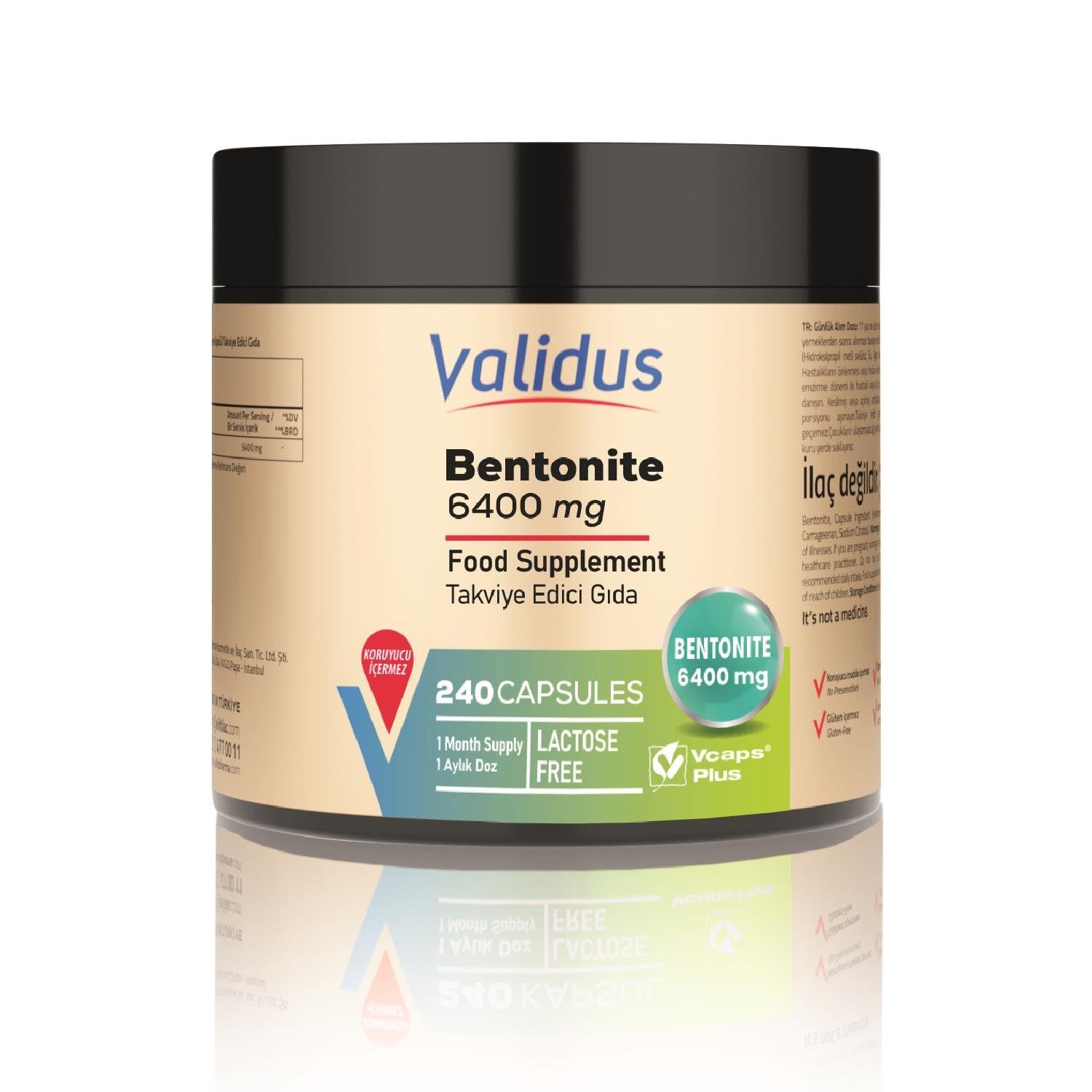 Validus Bentonite 6400 mg 240 Capsules Preservatives Free Sweeteners Free Gluten Free lactose Free It is produced using special actives obtained from standardized extracts. THE RIGHT ADDRESS FOR A HEALTHY LIFE!. High Quality Products High-Level Experience Expert Team Regular Quality Control Sustainable Raw Materials We began with the goal of providing our consumers with world-class quality Food Supplement products, and since 2003, we have grown to become one of Turkey's most inventive production and marketing firms. We have produced in modern and sanitary conditions in the facility we established for food supplements, meeting world standards. We hold ISO 9001, ISO 22000, ISO 22716, ISO 13485, and Ministry of Health GMP certifications from approved companies