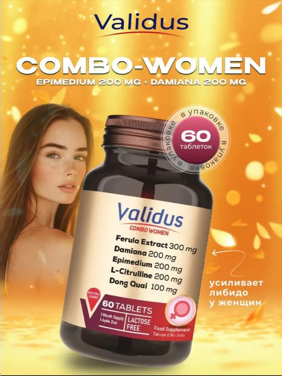 Validus combo-women is a vitamin complex designed specifically to support women's health and boost vitality. Its unique formula, enriched with natural extracts such as epimedium, damiana, ginseng, and fenugreek, as well as B vitamins, folic acid, and amino acids, helps boost libido, improve overall well-being, and strengthen the immune system. Validus combo-women requires no prescription and easily fits into your daily diet, helping you feel energized and confident.