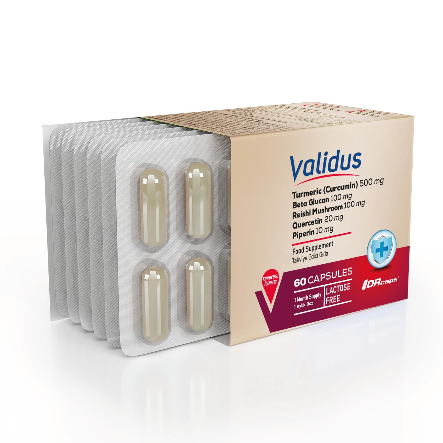 Validus Curcumin 500 mg Piperin Inula Henelium Astragalus Quercetin Reishi Moringa 60 Capsules Preservatives Free Sweeteners Free Gluten Free lactose Free It is produced using special actives obtained from standardized extracts. THE RIGHT ADDRESS FOR A HEALTHY LIFE!. High Quality Products High-Level Experience Expert Team Regular Quality Control Sustainable Raw Materials We began with the goal of providing our consumers with world-class quality Food Supplement products, and since 2003, we have grown to become one of Turkey's most inventive production and marketing firms. We have produced in modern and sanitary conditions in the facility we established for food supplements, meeting world standards. We hold ISO 9001, ISO 22000, ISO 22716, ISO 13485, and Ministry of Health GMP certifications from approved companies