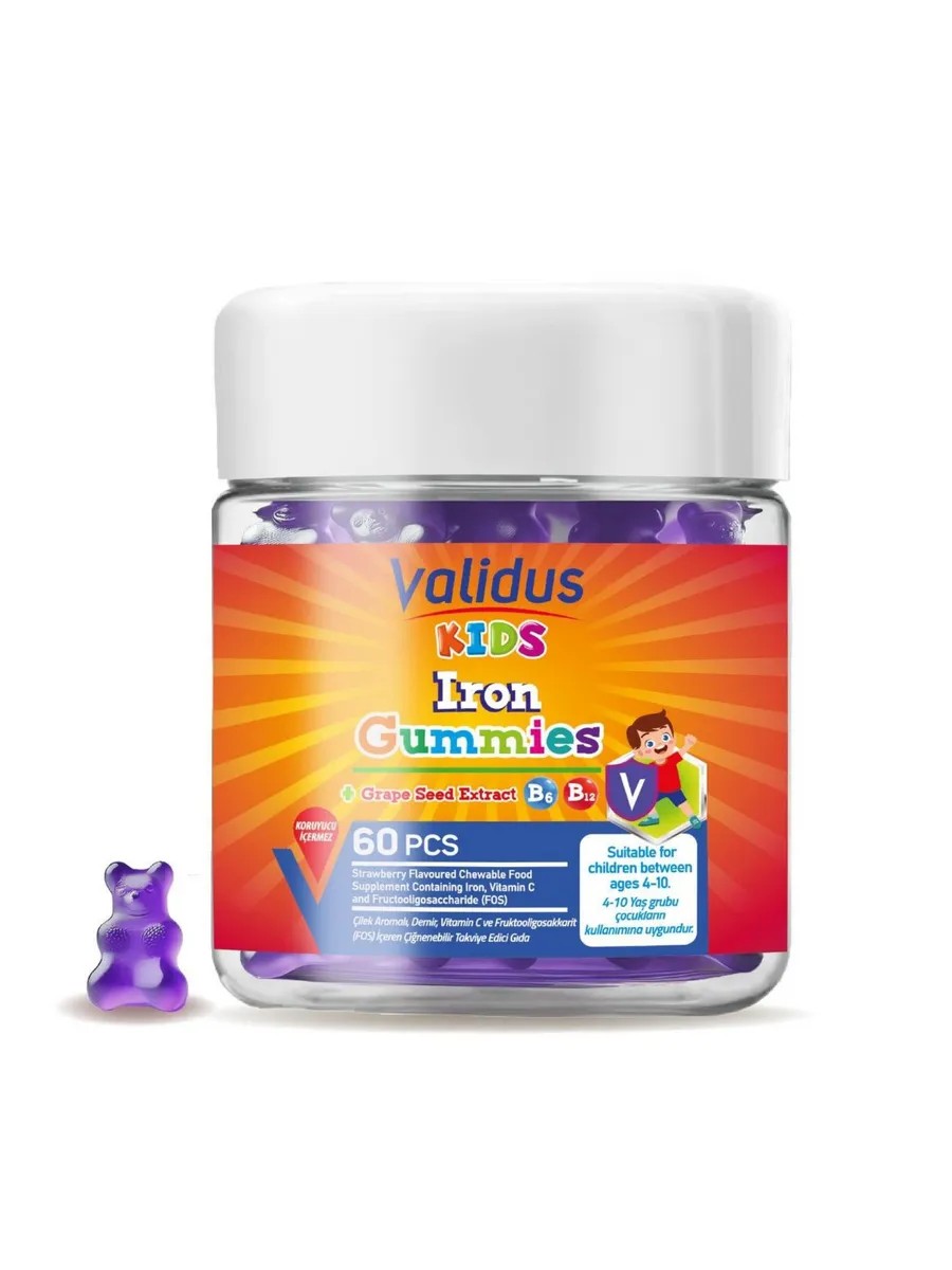 Validus Kids Iron+Vitamin C+Vitamin B6-B12+FOS are delicious chewable gummies (pectin-based), enriched with iron, vitamin C, B vitamins (B6 and B12) and fructooligosaccharides (FOS).