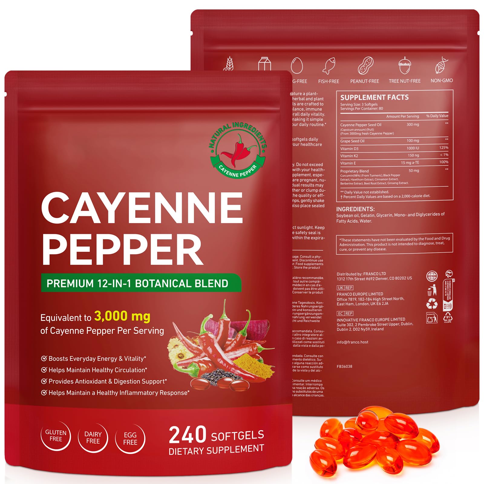 Plant-Based Wellness Made Simple: Enjoy the benefits of a premium 12-in-1 botanical blend in easy-to-swallow softgels. This vegan-friendly, plant-forward supplement provides an convenient 80-day supply to seamlessly integrate into your daily health routine. Immune Bone Health with D3 K2: Fortified with essential vitamins D3 and K2, this supplement helps support a healthy immune system and contributes to the maintenance of strong, healthy bones by aiding calcium utilization. Enhanced Absorption Digestive Balance: This formula is thoughtfully crafted with Black Pepper and Turmeric to help support nutrient absorption and digestive balance, making the active ingredients more bioavailable for your body. Comprehensive Cardiovascular Support: Our unique blend pairs Cayenne with Grape Seed, Hawthorn, and Beetroot to help promote healthy blood flow and provide robust support for your overall cardiovascular system and antioxidant health. Potent Cayenne Pepper Formula: Experience a boost in everyday energy and vitality with a serving equivalent to 3,000 mg of Cayenne Pepper, designed to help maintain healthy circulation and support a healthy inflammatory response.