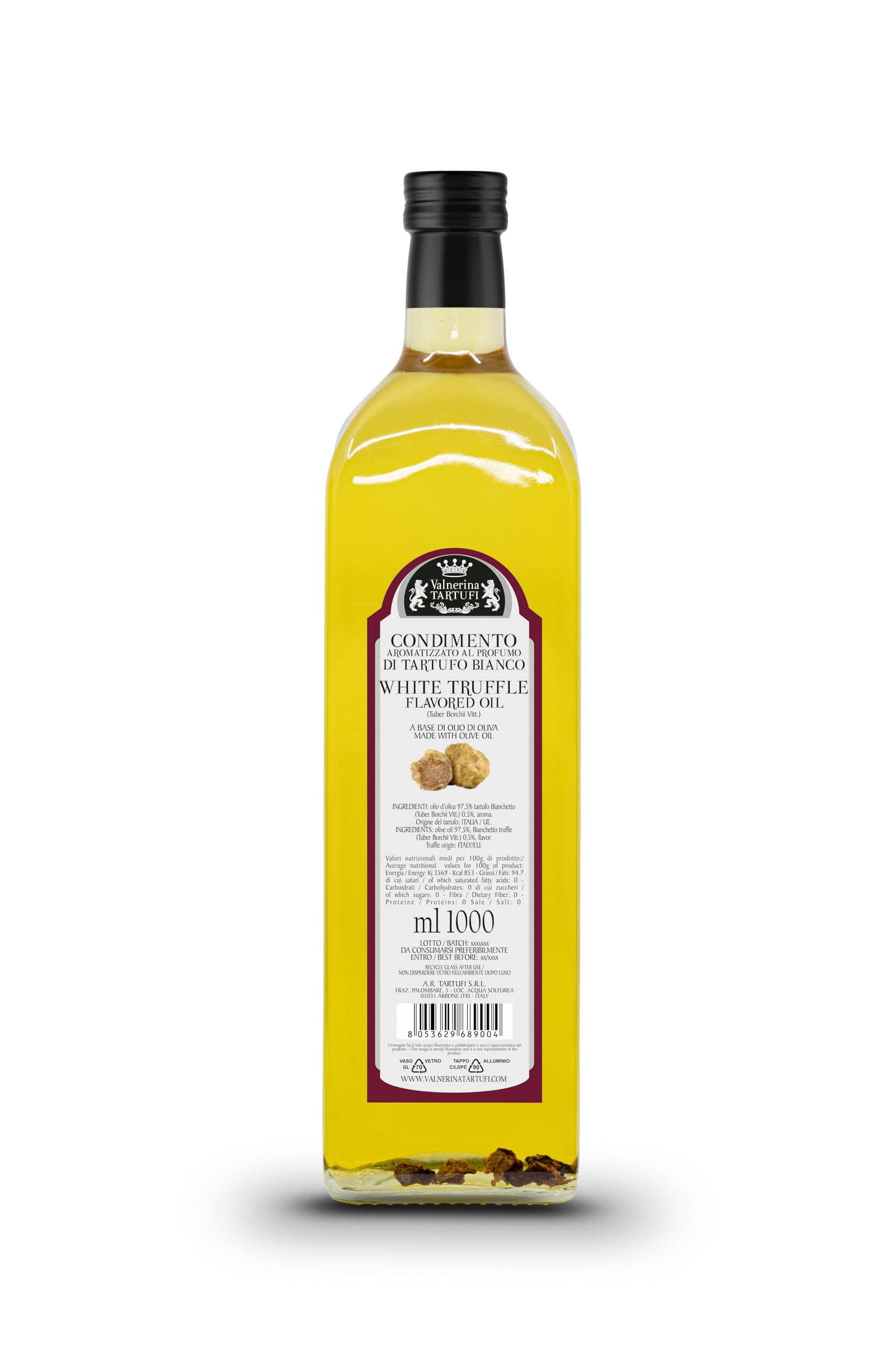With just a few drops of our truffle-infused oil, you can enhance any dish. The olive oil we use brings out the truffle flavor, creating a product that will be irreplaceable at all your meals. Ready to use and available in various sizes for any occasion. It is ideal for seasoning bruschetta, pasta, meat, and fish. This is an artisanal Italian product, prepared without colorings or preservatives. Texture: Liquid. Color: Typical of the oil: greenish. Aroma: Typical of the oil with hints of summer black truffle. Flavor: Typical of the oil with hints of summer black truffle. Ingredients: Olive oil 97.5 , white truffle (Tuber clous vitt.) 0.5 , flavoring. Storage and usage instructions. Store the product in a cool, dry place. Ready to use straight from the bottle. Expiration date: 24 months from the packaging date Average nutritional values (per 100g of product) Energy value: 853 kcal - 3569 kJ Protein: 0 g Carbohydrate: 0 g of which sugars: 0 g Fat: 94.7 g of which saturates: 0 g Salt: 0 g INGREDIENTS Olive oil 97.5 , White truffle (Tuber clous vitt.) 0.5 , flavoringValnerina Tartufi Huile d'olive aromatisée à la truffe blanche Assaisonnement au parfum de truffe Bouteille 1000 ml.DESCRIPTION DU PRODUIT DESCRIPTION DU PRODUIT Avec quelques gouttes de notre huile aromatisée truffe, vous pourrez enrichir n'importe quel port. L'huile d'olive que nous utilisons fait ressortir le goût de la truffe, créant ainsi un produit qui sera irremplaçable à tous vos repas. Prêt à l'emploi et disponible en différents formats pour tout type d'occasion. Il est idéal pour assaisonner les bruschettes, pâtes, viande et poisson. C'est un produit artisanal et italien, préparé sans colorants ni conservateurs. Texture : liquide. Couleur : typique de l'huile : verdâtre. Odeur : typique de l'huile avec senteurs de truffe noire d'été Saveur : typique de l'huile avec sensations de truffe noire d'été Ingrédients : Huile d'olive 97,5 , truffe blanche (Tuber clous vitt.) 0,5 , arôme. Modalités de conservation et d'utilisation. Conserver le produit dans un endroit frais et sec. Produit prêt à l'emploi directement de la bouteille. Date d'expiration : 24 mois à compter de la date de conditionnement Valeurs nutritionnelles moyennes (pour 100 g de produit) Valeur énergétique : 853 Kcal - 3569 Kj Protéines : 0 g. Glucides : 0 g. dont sucres : 0 g. Graisses : 94,7 g. dont acides gras saturés : 0 g. Sel : 0 g. INGRÉDIENTS Huile d'olive 97,5 , Truffe blanche (Tuber clous vitt.) 0,5 , arôme