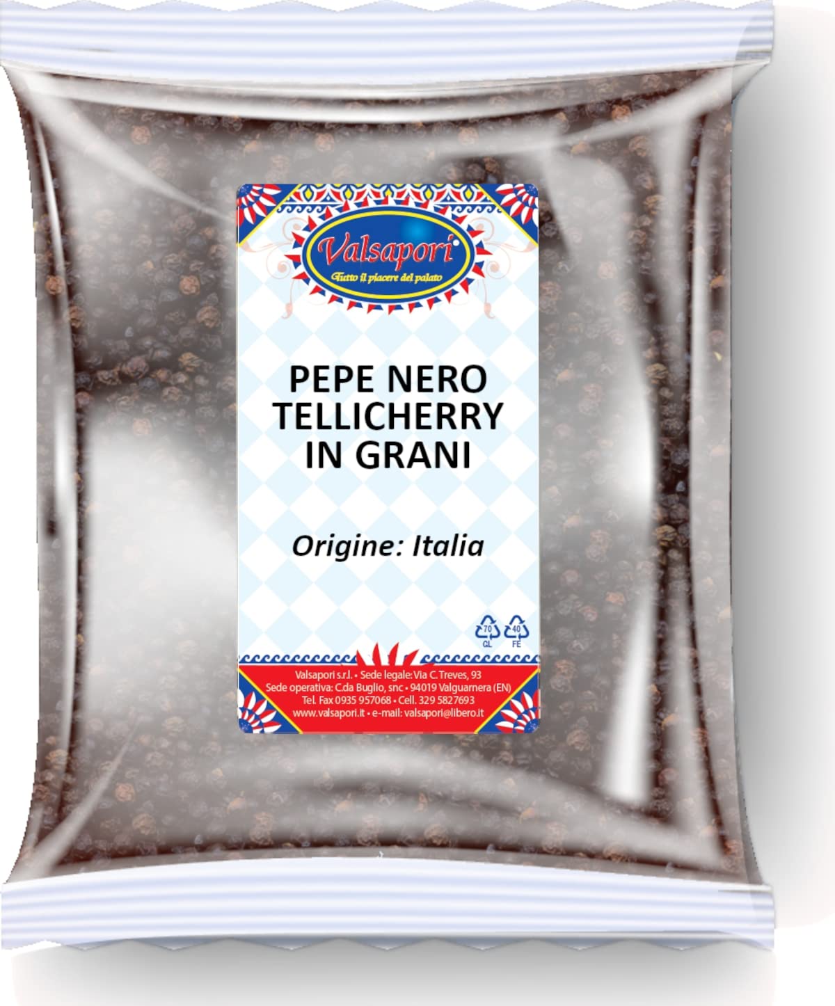 Valsapori Tellicherry Black Peppercorns in a 100g bag - 100% natural Sicilian cultivation - Late harvest with a pungent taste -