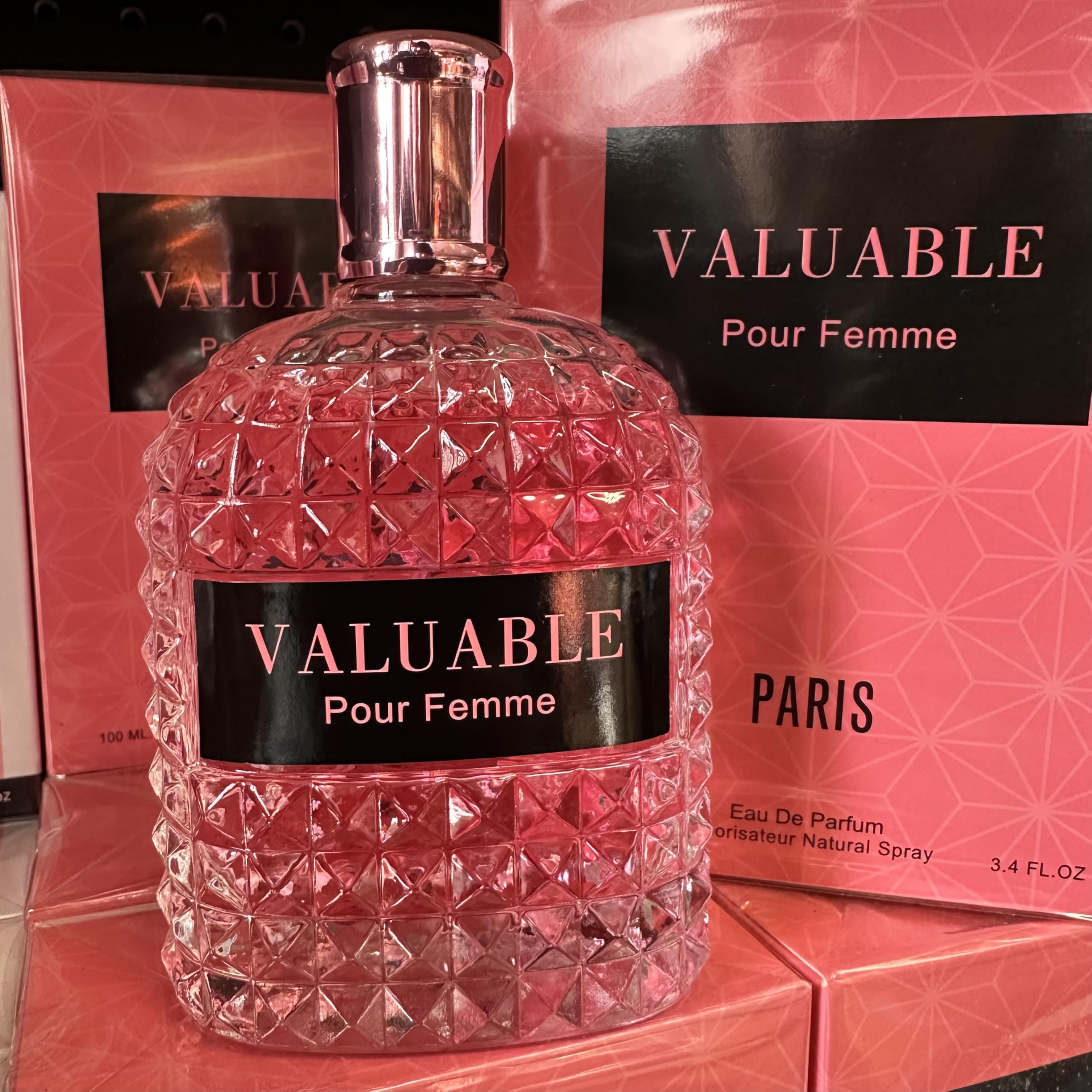 Introducing Valuable Pour Femme, an exquisite fragrance that embodies sophistication and elegance. The stunning 3.4 fl. oz. bottle features a mesmerizing geometric cut-glass design that catches and reflects light beautifully, making it a gorgeous addition to any vanity. This eau de parfum comes in a natural spray format, perfect for easy application. The luxurious pink packaging and Parisian inspiration speak to its refined character. The crystal-like bottle design showcases attention to detail, with its intricate diamond-pattern texture and polished silver cap adding a touch of glamour. This feminine fragrance comes beautifully presented in matching pink packaging, making it an ideal gift choice or personal indulgence. The substantial size ensures long-lasting enjoyment of this sophisticated scent. Val. Smell.