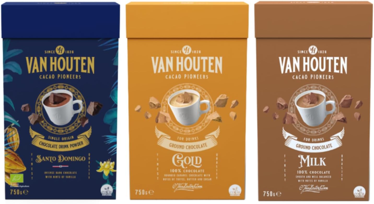 THESE ARE THE 6 FLAVOURS OF THE VAN HOUTEN GROUND CHOCOLATE FLAKES BEST FOR HOT AND COLD DRINKS. HALAL AND KOSHER CERTIFIED PLUS NON-GMO. INCLUDES THE FLAVOURS OF : INTENSE DARK GROUND MILK GROUND GOLD GROUND RUBY GROUND WHITE GROUND SANTO DOMINGO