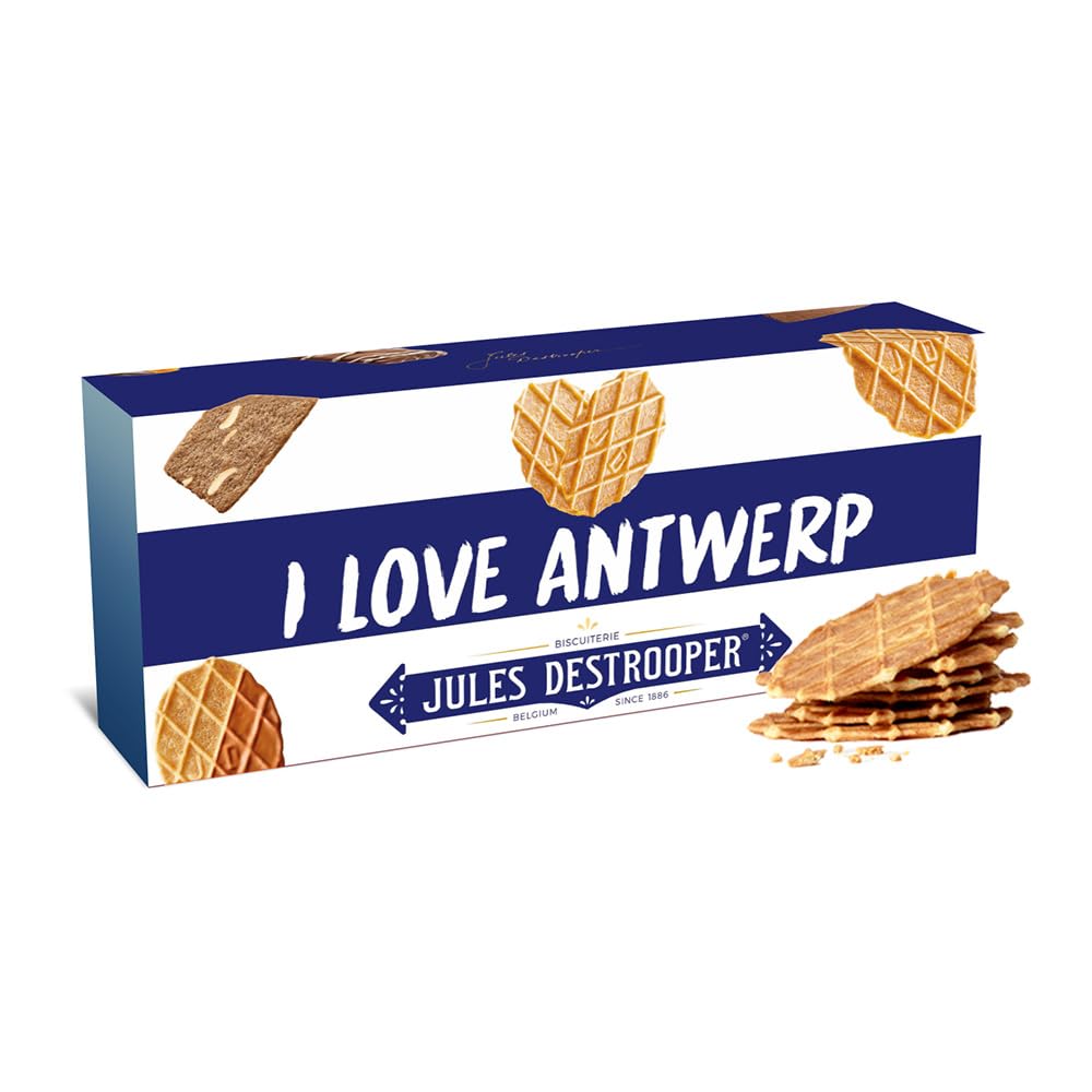 This biscuit pack pays homage to the vibrant energy and cultural diversity of the Belgian city of Antwerp. Known for its bustling port, historic architecture, and thriving art scene, Antwerp attracts countless visitors from all over the world each year. This special gift set was designed to celebrate the love of Antwerp and offer visitors a delicious and memorable experience. The pack contains two 100g boxes of Jules Destrooper's most popular biscuit: natural butter waffles. The front of the pack reads "I love Antwerp" and the back "J'aime Anvers." Whether you're visiting Antwerp yourself or looking to surprise foreign friends with a unique gift, this gift set is the perfect way to show your appreciation for this beautiful city and its unique heritage. INGREDIENTS WHEAT flour, sugar, butter (18 ) (MILK), free-range EGGS, raising agent: ammonium carbonates, sea salt.