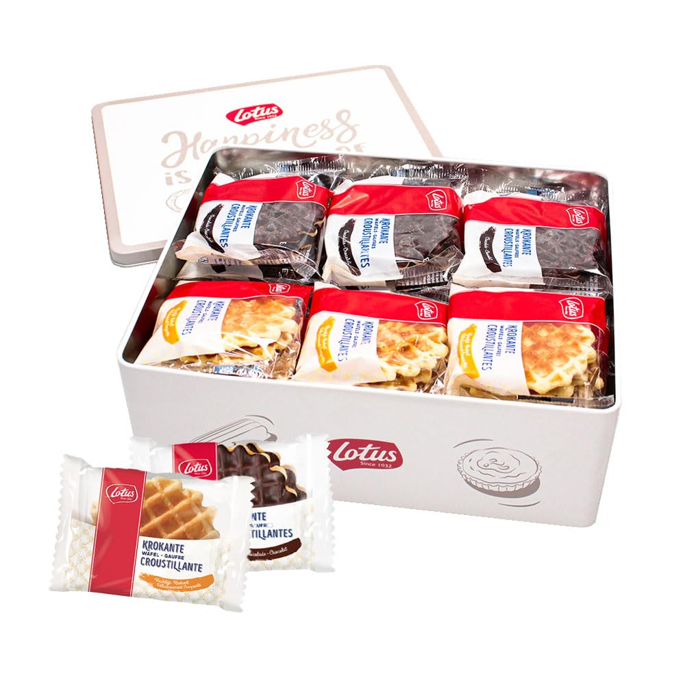 Discover this Lotus biscuit tin filled with 492g of a mix of Crispy Wafers that will delight lovers of crunchy treats! This tin contains 12 Lotus Vanilla Wafers (2 per pack) and 12 Lotus Chocolate Wafers (2 per pack). Beautifully presented, this biscuit tin is ideal as a gourmet gift or for enjoying yourself with a delicious cup of coffee. Each biscuit is individually wrapped to guarantee freshness, and the tin adds a touch of nostalgia to your home, while also being reusable. INGREDIENTS Lotus Crispy Wafers Vanilla 2 pieces - 18g: Ingredients: WHEAT flour, sugar, vegetable oils (palm, rapeseed), free-range EGGS, salt, flavoring, emulsifier (SOY lecithin). Made in a workshop that uses: MILK Lotus Krokante Wafels Chocolate 2 pieces - 23g: Ingredients: WHEAT flour, sugar, chocolate 22 (sugar, cocoa mass, cocoa butter, butyric fat (MILK), emulsifier (SOYA lecithin and E476)), vegetable oils (palm, coconut, rapeseed), free-range EGGS, salt, flavouring, emulsifier (SOYA lecithin).Lotus boîte de biscuits 'mélange de gaufres croustillantes' - 24 pièces - Gaufres croustillantes à la vanille - Gaufres croustillantes au chocolat - biscuits pour le café - boîte de biscuits - 492gDESCRIPTION DU PRODUIT DESCRIPTION DU PRODUIT Découvrez cette boîte à biscuits Lotus remplie de 492g d'un mélange de Gaufrettes Croustillantes qui ravira les amateurs de douceurs croustillantes ! Ce coffret contient 12 gaufrettes Lotus Vanille (2 par paquet) et 12 gaufrettes Lotus Chocolat (2 par paquet). Parfaitement présentée, cette boîte de biscuits est idéale comme cadeau gourmand ou pour savourer vous-même avec une délicieuse tasse de café. Chaque biscuit est individuellement emballé pour garantir la fraîcheur, et la boîte ajoute une touche nostalgique à votre maison, tout en pouvant être réutilisée après usage. INGRÉDIENTS Lotus Krokante Wafels Vanille 2 stuks - 18g: Ingrédients: Farine de BLÉ, sucre, huiles végétales (palme, colza), OEUFS de poules élevées au sol, sel, arôme, émulsifiant (lécithine de SOJA). Fabriqué dans un atelier qui utilise: LAIT Lotus Krokante Wafels Chocolade 2 stuks - 23g: Ingrédients: Farine de BLÉ, sucre, chocolat 22 (sucre, pâte de cacao, beurre de cacao, graisse butyrique (LAIT), émulsifiant (lécithine de SOJA et E476)), huiles végétales (palme, noix de coco, colza), OEUFS de poules élevées au sol, sel, arôme, émulsifiant (lécithine de SOJA).
