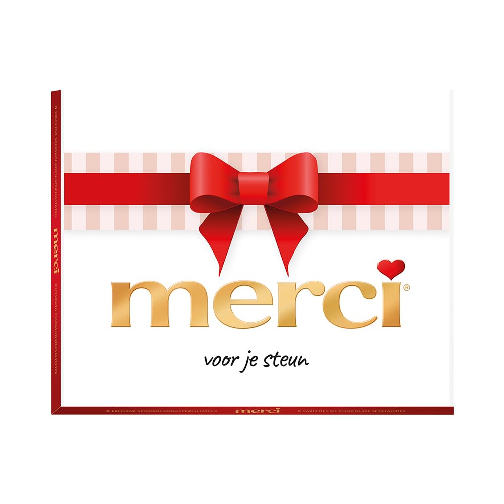 Express your gratitude with this "Thank You" chocolate gift to thank someone for their support. This box contains 250g of Merci Finest Selection chocolate bars, with 8 delicious flavors: milk chocolate, mocha cream, almond-hazelnut, hazelnut praline, marzipan, dark chocolate, dark chocolate mousse, and milk praline. This chocolate gift comes in beautiful packaging with the message "Thank you for your support," ideal for expressing your gratitude to someone who has supported you. Translated with DeepL.com (free version) INGREDIENTS Ingredients: sugar, cocoa butter, whole milk powder, cocoa mass, cream powder, chopped almonds (4.3 ), vegetable fats (palm, shea), skimmed milk powder, ground hazelnuts (1.8 ), lactose, concentrated butter, buttermilk powder, dextrose, wheat flour, rice flour, emulsifier: lecithins (soy), coffee, fat-reduced cocoa powder, fructose, wheat protein, salt, flavorings, wheat malt. Cocoa: 32 minimum in whole milk chocolate, Cocoa: 32 minimum in cream chocolate, Cocoa: 45 minimum in whole milk dark chocolate. The proportions of the ingredients may vary slightly depending on the production.merci Finest Selection Assorted bonbons de chocolat "merci voor je steun" - 8 saveurs de chocolat - cadeau en chocolat pour remercier quelqu'un - 250gDESCRIPTION DU PRODUIT DESCRIPTION DU PRODUIT Exprimez votre gratitude avec ce cadeau chocolat merci pour remercier quelqu'un de son soutien. Ce coffret contient 250g de tablettes de chocolat Merci Finest Selection, avec 8 délicieuses saveurs: chocolat au lait, crème moka, amande-noisette, praliné noisette, massepain, chocolat noir, mousse au chocolat noir et praliné au lait. Ce cadeau chocolat est présenté dans un bel emballage avec le message "merci pour votre soutien", idéal pour exprimer votre gratitude à quelqu'un qui vous a soutenu. Traduit avec DeepL.com (version gratuite) INGRÉDIENTS Ingrédients: sucre, beurre de cacao, lait entier en poudre, pâte de cacao, crème en poudre, amandes hachées (4,3 ), graisses végétales (palme, karité), lait écrémé en poudre, noisettes moulues (1,8 ), lactose, beurre concentré, babeurre en poudre, dextrose, farine de froment, farine de riz, émulsifiant: lécithines (soja), café, cacao maigre, fructose, protéines de blé, sel, arômes, malt de froment. Cacao: 32 minimum dans le chocolat au lait entier, Cacao: 32 minimum dans le chocolat à la crème, Cacao: 45 minimum dans le chocolat noir au lait entier. Les proportions de la composition peuvent varier légèrement selon la production.
